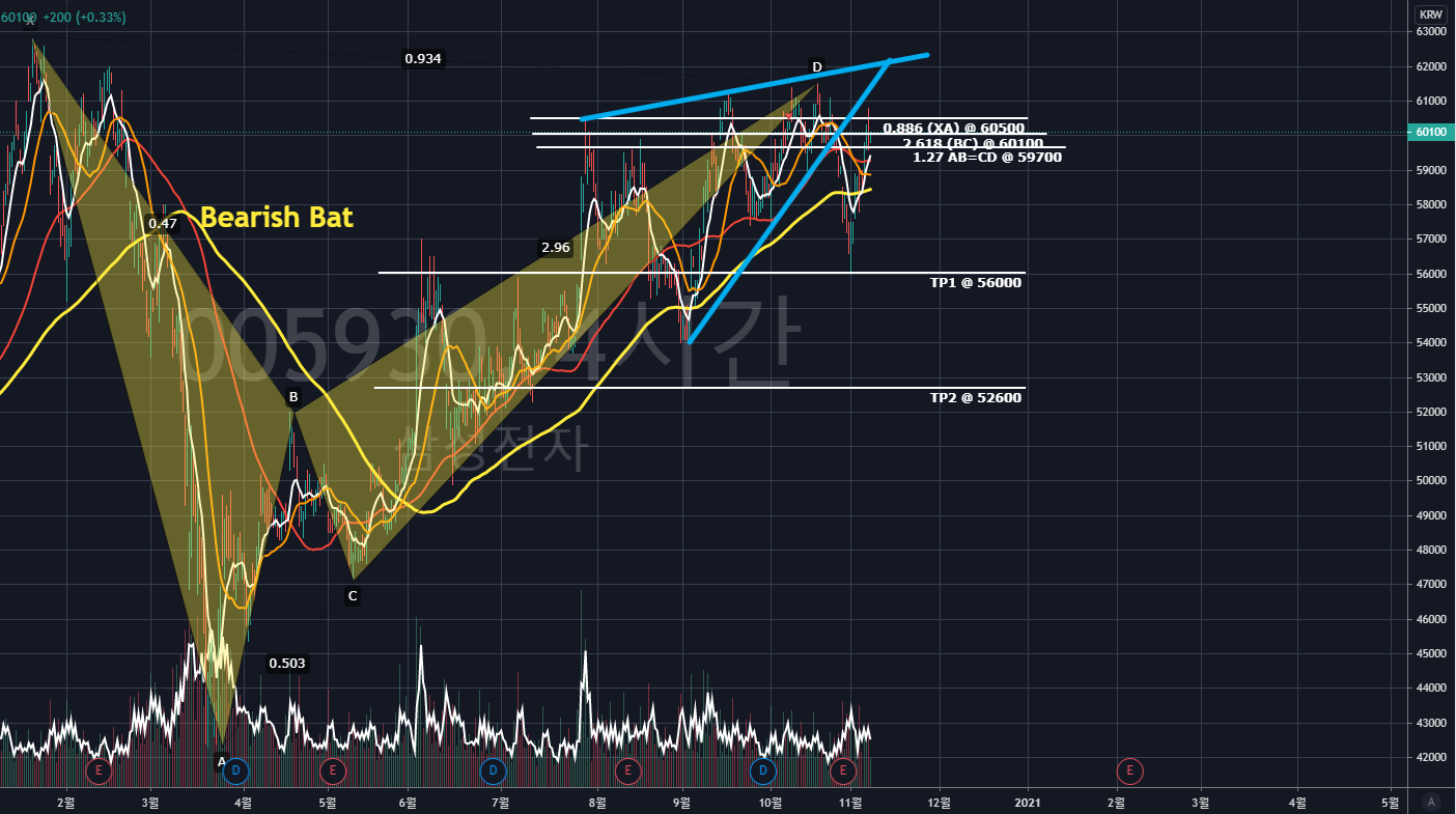 삼성전자의 차트를 보면, Bearish Bat의 0.886 (XA), 2.618 BC Projection, 1.27 AB=CD 의 PRZ를 테스트한 후 하락반전하고 있는 것으로 보입니다.