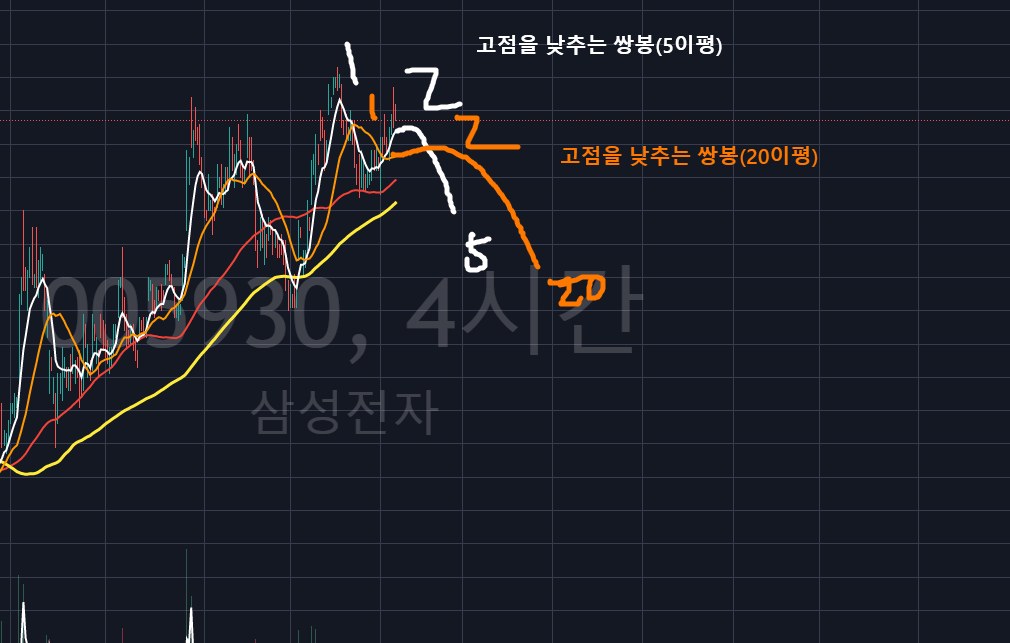 위의 차트대로, 고점을 낮추는 쌍봉이 나올경우, 하락추세는 강력하게 나오며, 꽤나 길게 나올 것으로 보이네요.
