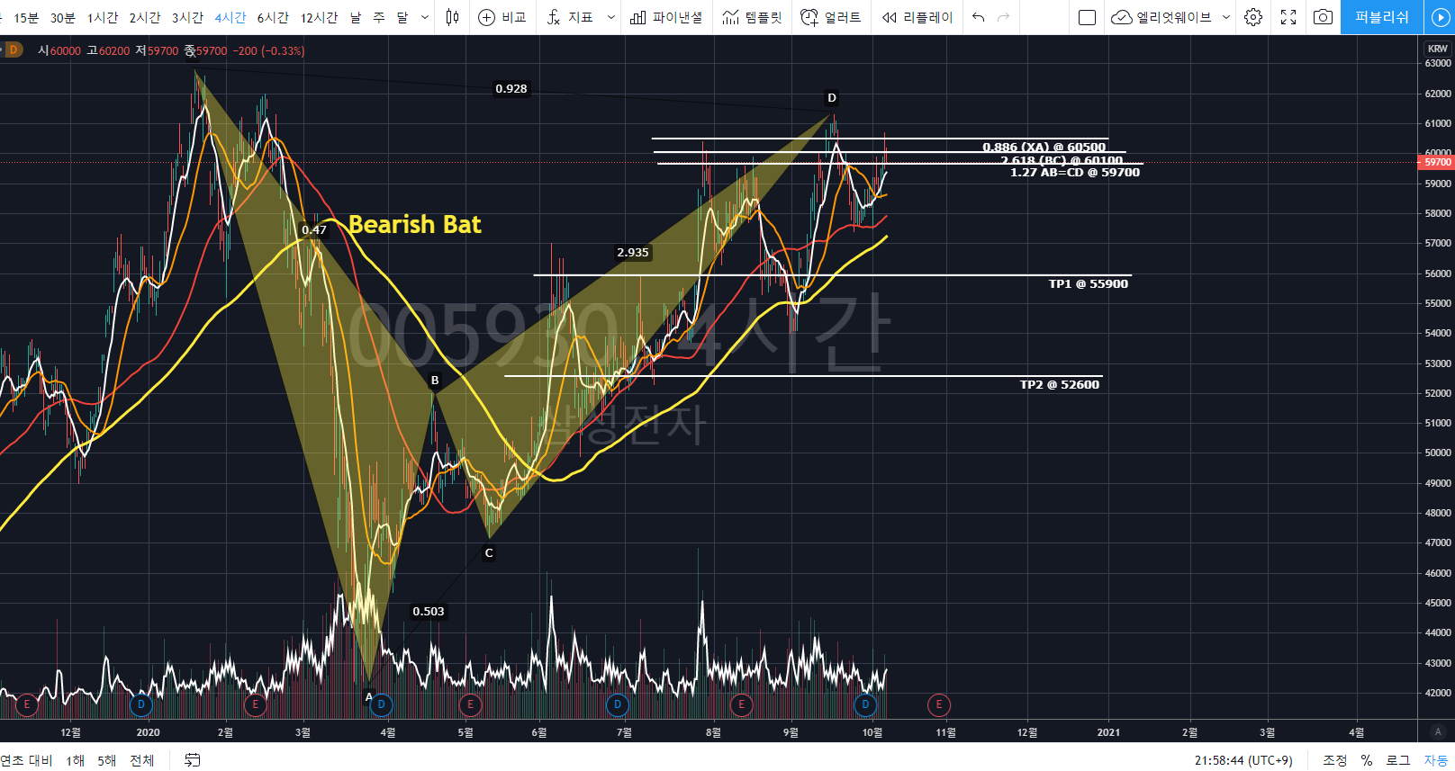 삼성전자는 Bearish Bat의 PRZ를 테스트 한 후 라이징 웻지의 상단부근까지 고점을 높이다가 하락전환하여 폴링웻지를 하향돌파하는 흐름이 나왔습니다. 이후 주가는 TP1까지 도달하였네요.