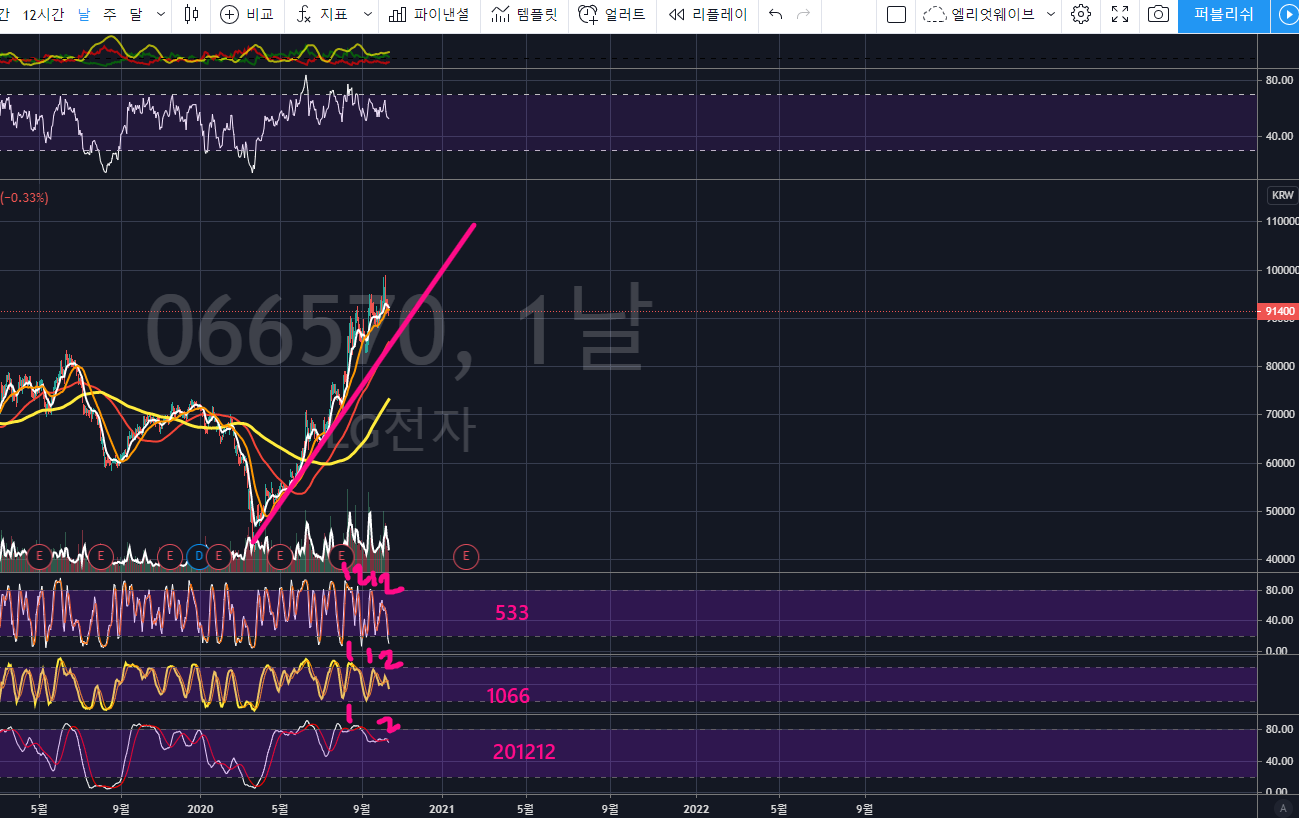 LG전자 주가의 일봉차트를 보면, 스토캐스틱 201212가 고점을 낮추는 쌍봉,
