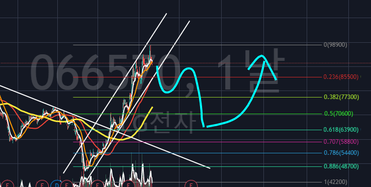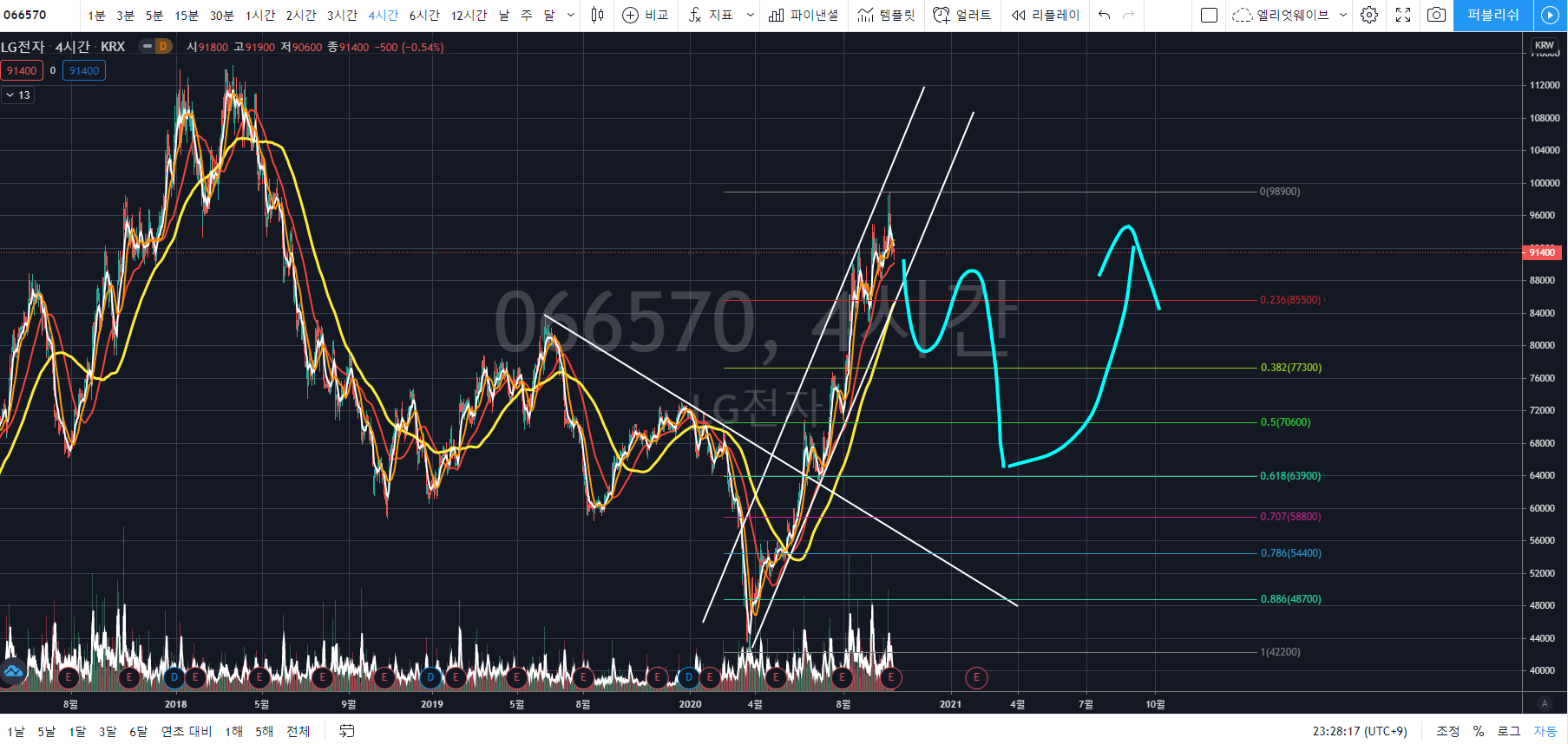 아마도 LG전자의 주가가 조정을 시작한다면, 피보나치 0.5~0.618되돌림까지 하락할 수 있어보입니다.