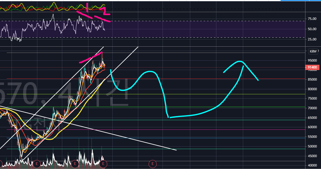 7만원대 중후반까지 온 후 좋은 진입자리가 나올 것 같습니다. 이후 9만원 부근에서 익절 후 다시 자리를 보는 것이 좋겠네요.
