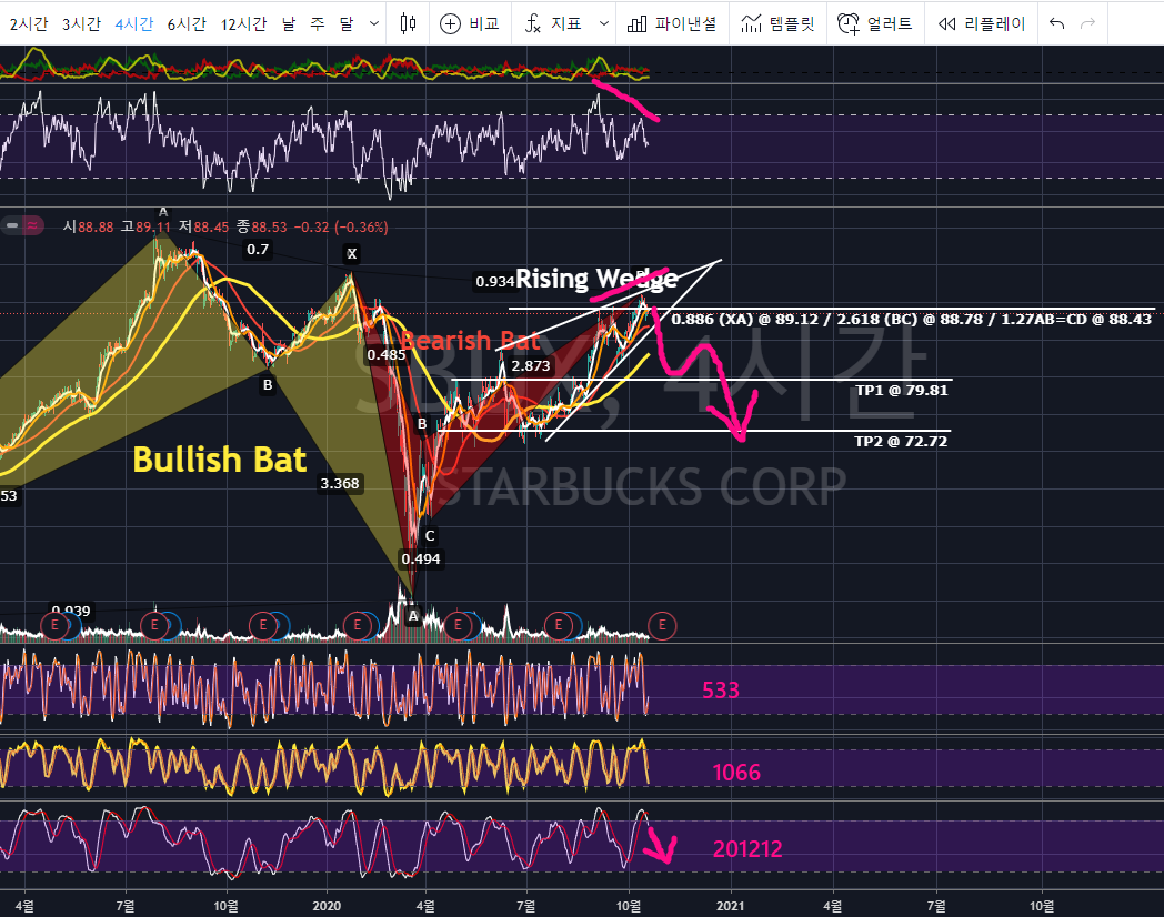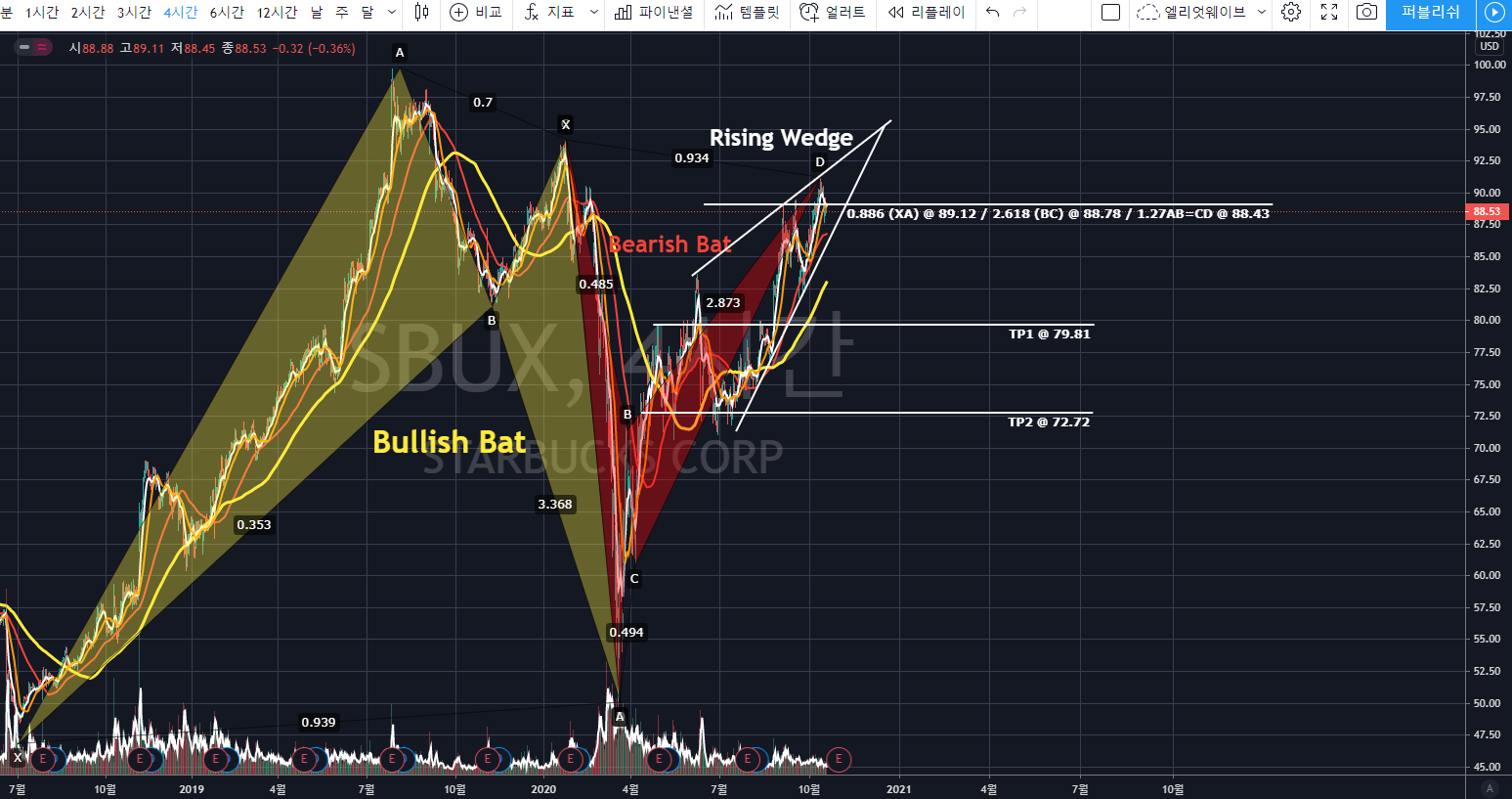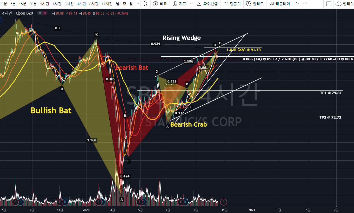 위의 스타벅스 4시간봉 차트를 보면, 노란색 Bullish Bat Pattern의 0.886(XA)에서 반전한 후 TP2를 지나는 상승이 나왓습니다. 현재 빨간색 Bearish Bat의 0.886 (XA), 2.618 BC Projection, 1.27 AB=CD의 PRZ를 테스트 하였으며,