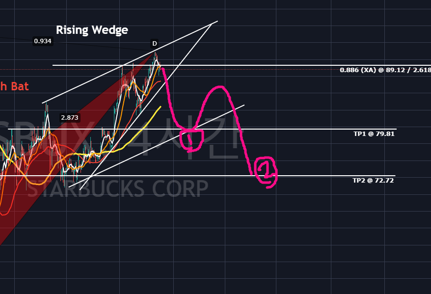 이곳에서 더 작은 노란색 Bearish Crab의 1.618 (XA)을 찍으며 30분봉 이하 일반 하락다이버전스까지 적용된다면 더 큰 하락이 예상됩니다. 스타벅스 포지션을 보유하고 있다면 지금부터 70%~100% 정리하는 것이 좋아보이네요.