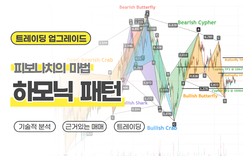책에서 배울 수 있는 패턴은 The AB=CD, Bat(+Alternative Bat), Gartley, Crab, Butterfly, Shark, Cypher입니다.