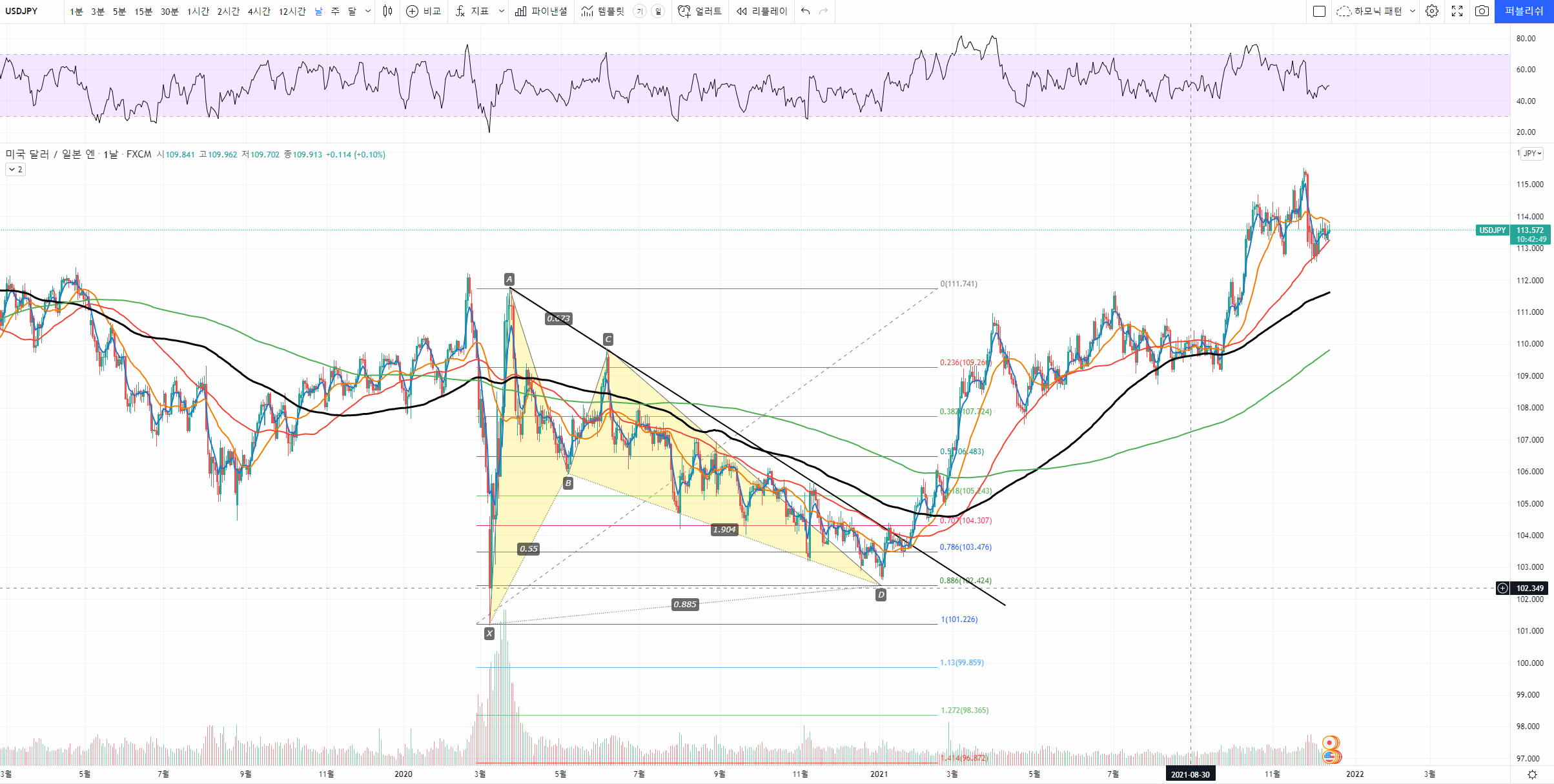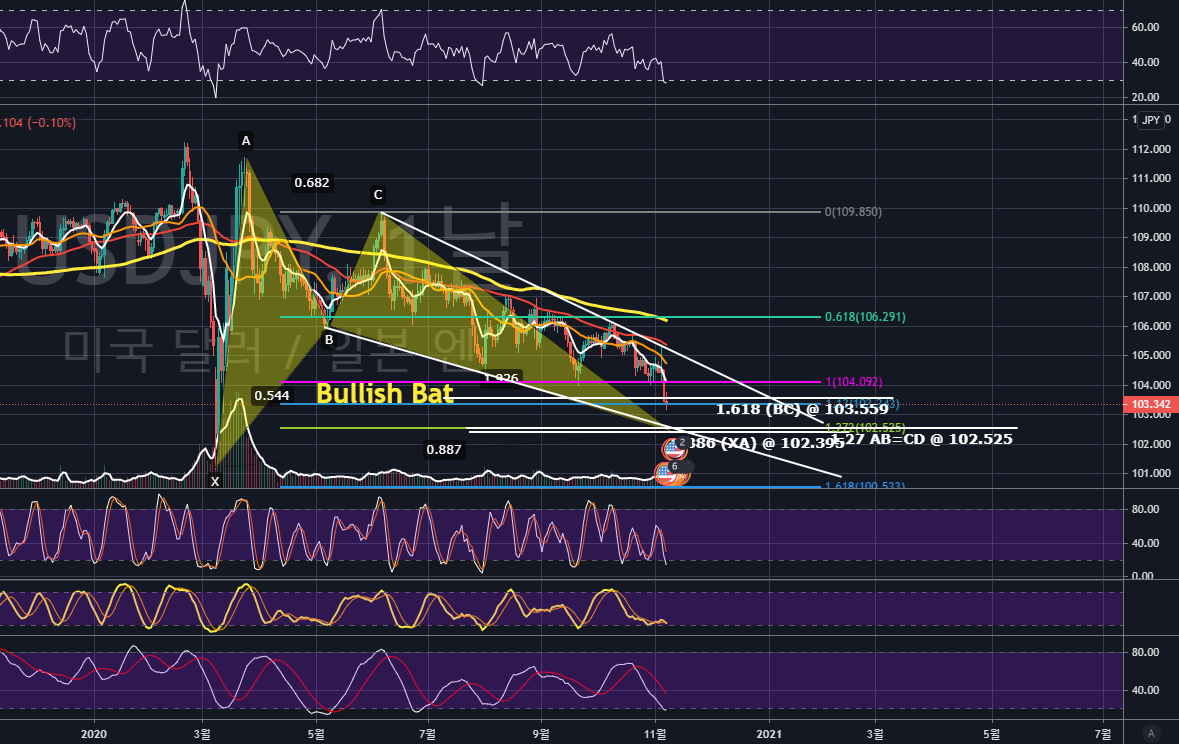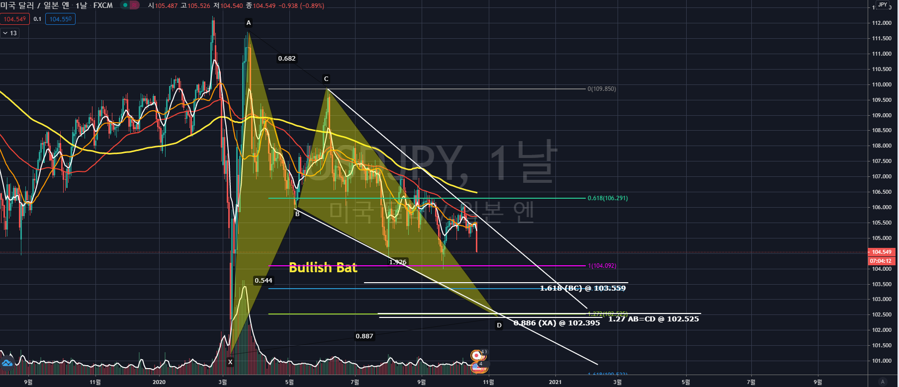 엔화 1일봉 차트에서 Bullish Bat Pattern이 보이네요.