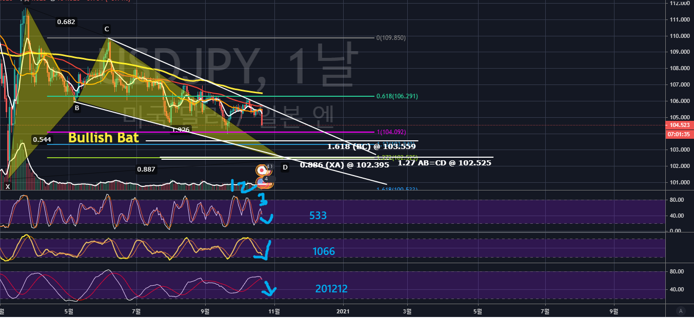 엔화 1일봉 차트에서 Bullish Bat Pattern이 보이네요.