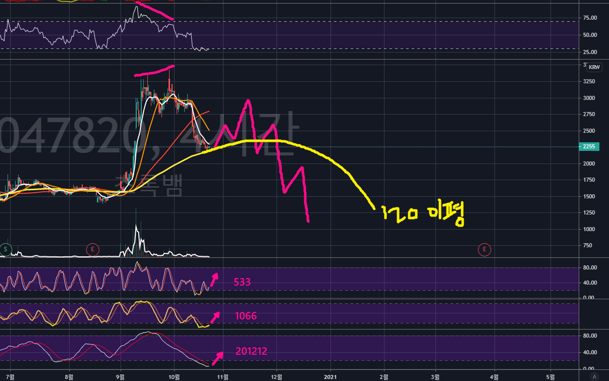 다시 상승하게 된다면 2750~3000원까지 상승할 수 있어보이네요. 물려있는 분들은 이 부근에서 탈출하는 게 좋지 않을까싶습니다.