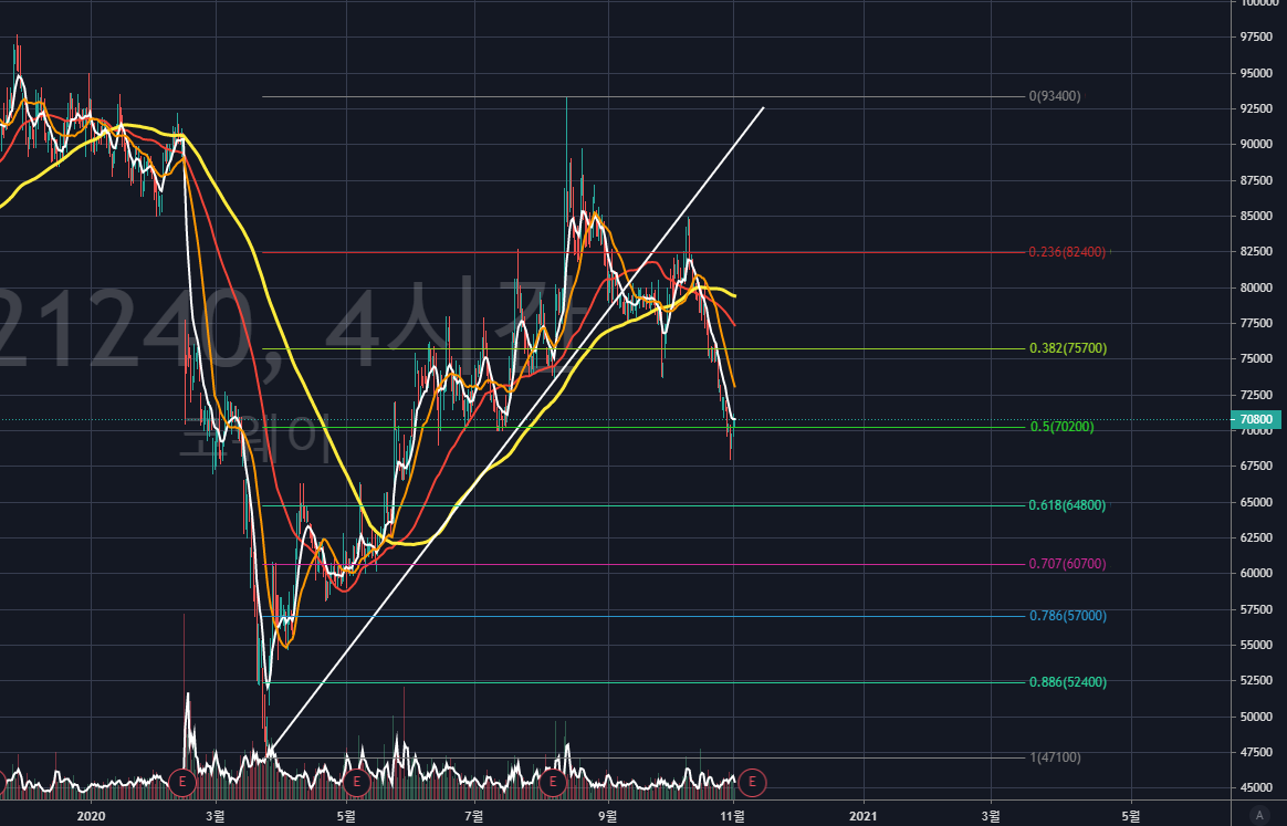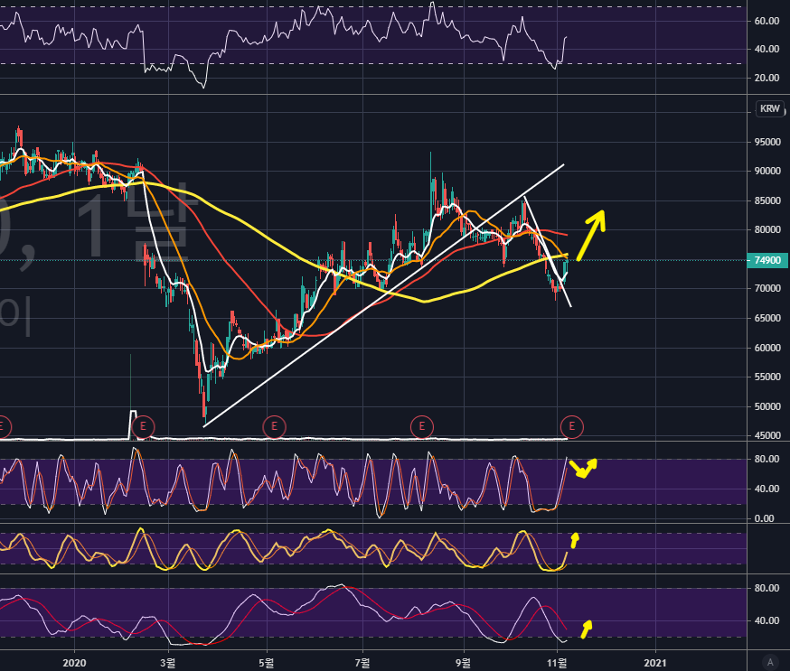 위와 같이 상승 추세선을 따라 움직이던 주가는, 조정을 가지다가 현재 단기 하락추세선과 맞닿아 있습니다. 이 하락추세선을 상향돌파하게 된다면 단기 상승세가 이어질 것으로 보이네요.