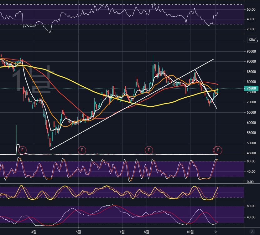 단기 하락 추세선을 상향 돌파하였고, 일봉 스토캐스틱 201212, 1066, 533이 모두 상방을 향하고 있어 상승 힘이 아직도 세게 남이있네요. 8만원 초중반대에 절반정도 익절한 후 나머지는 추세홀딩하기 좋은 차트로 보입니다.