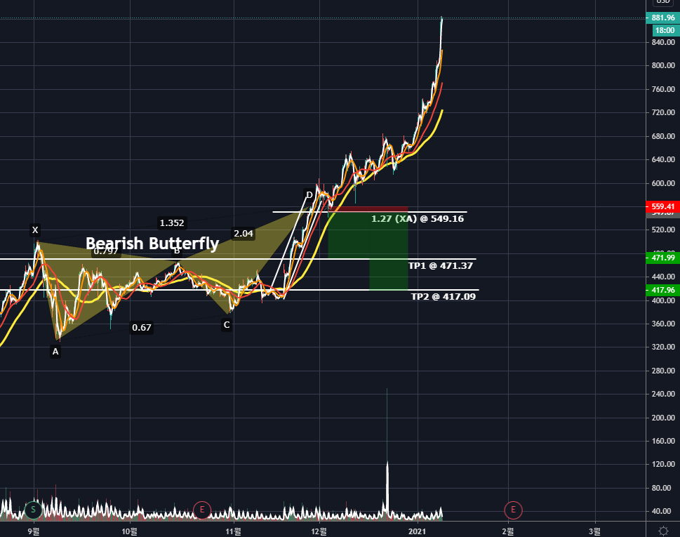 테슬라 4시간봉 차트를 보면, Bearish Butterfly 1.27 (XA)의 RPZ를 테스트하고 있습니다.
