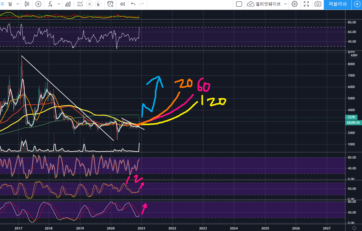 주봉에서 이런 상승시그널이 중복되서 나온 것이기 때문에, 금번 상승은 현재 3370원이 바닥지점일 것으로 보이며, 6천원 중후반~7천원대까지는 무난하게 상승하지 않을까 싶습니다.
