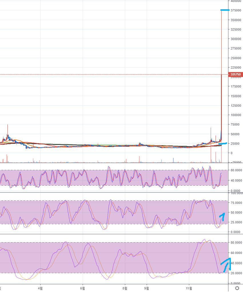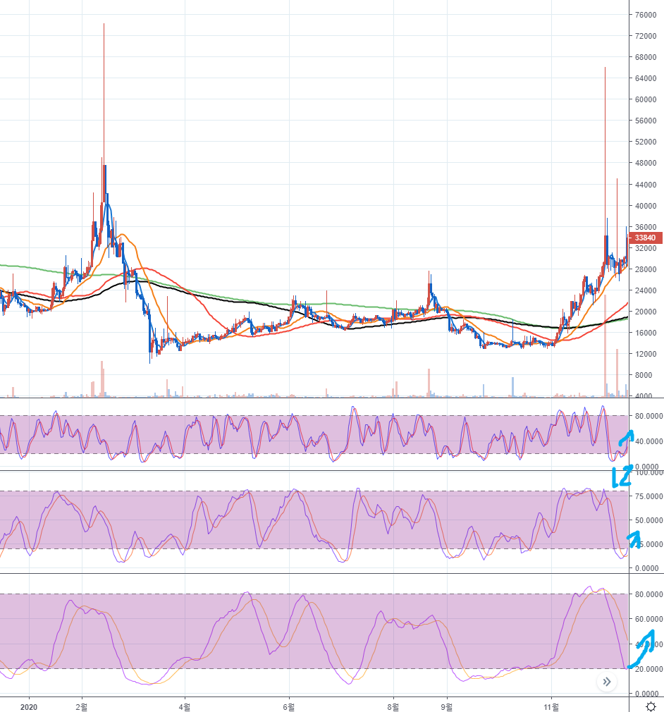 이후 단기간에 10배 이상의 상승을 보여줬습니다. 디크레드 매집한 세력의 성향도 있겠지만, 스토캐스틱과 이평선 등으로 미리 상승을 캐치할 수도 있습니다. 저는 부지런하지 못해서 미리 못본것이 아쉽네요. 여러 코인을 보면 차트가 좋은 코인이 많으니 잘 찾아보세요!