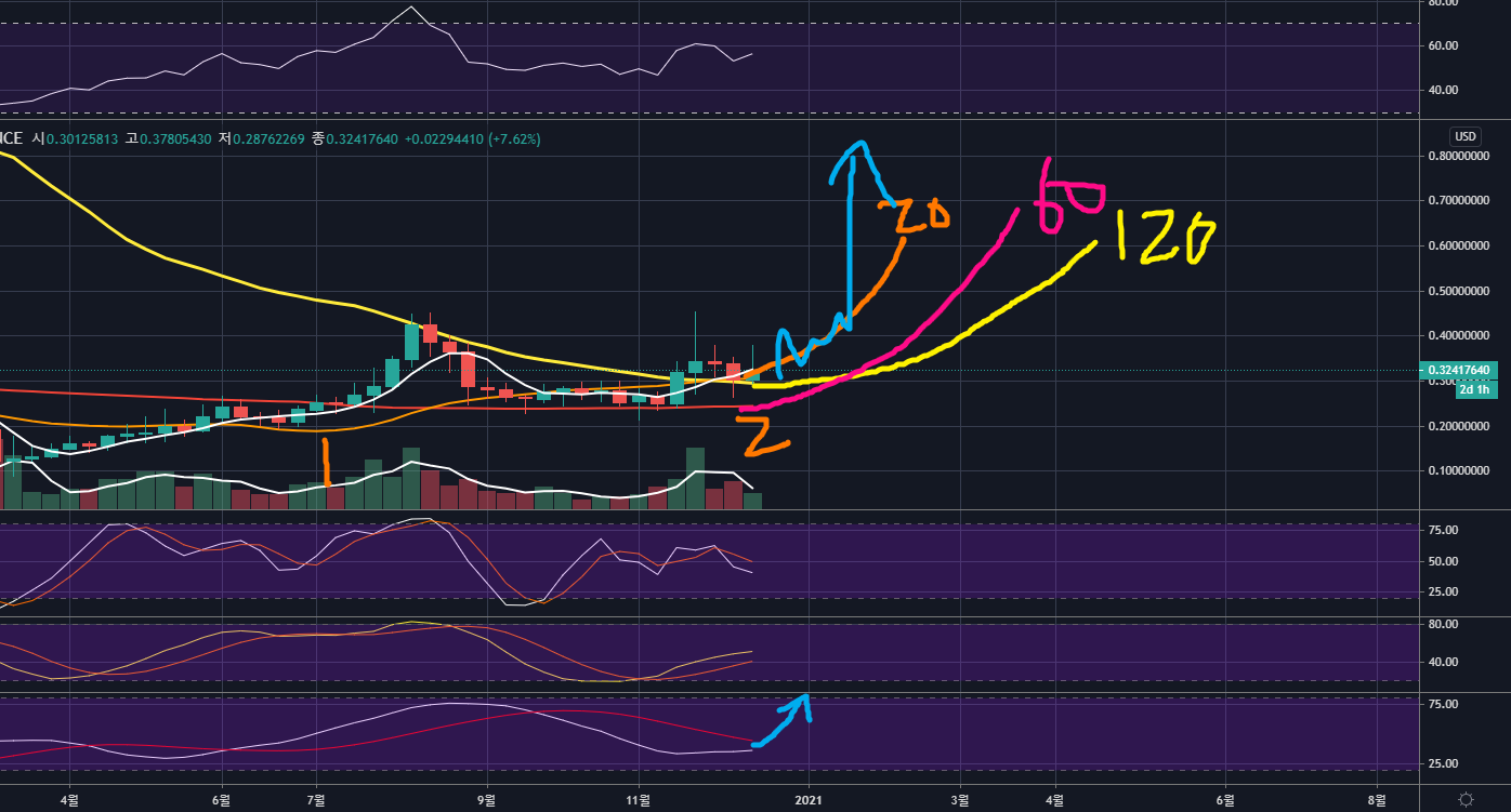 0.3달러인 현재부근에서, 상승한다면 빠르게 1달러에 도달할 것이라 보이며 6달러대 고점의 절반인 3달러까지도 21년에는 바라볼 수 있어보이네요.