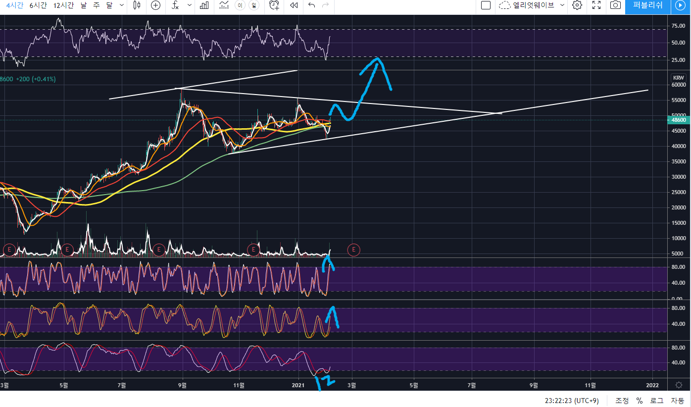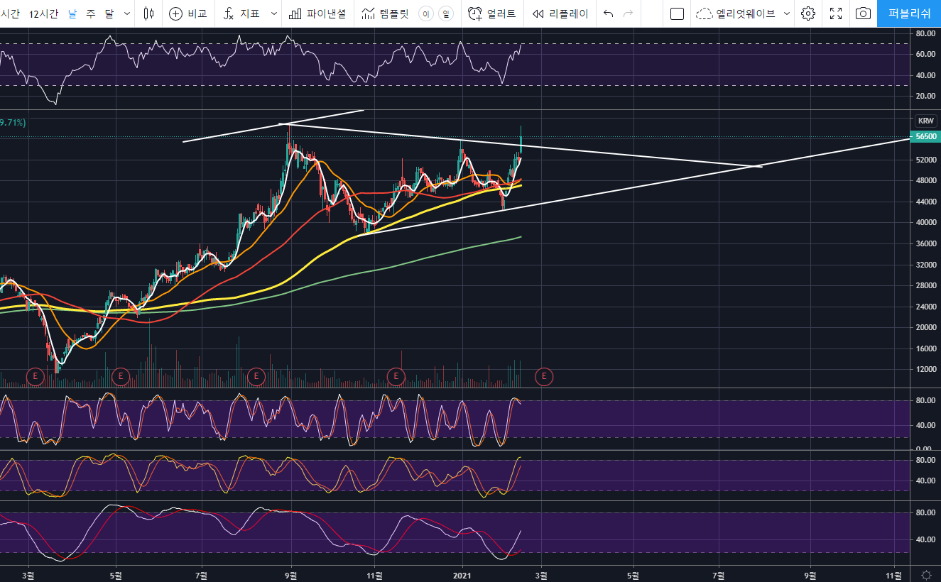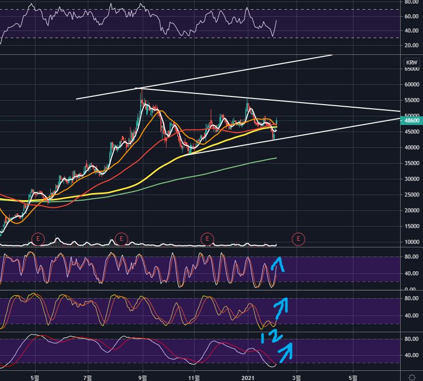 상승하게 된다면 현재 48600원에서 삼각수렴 상단인 66000원까지 최단기간 도달할 수 있어보입니다.