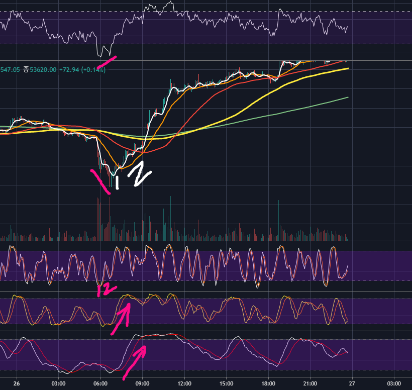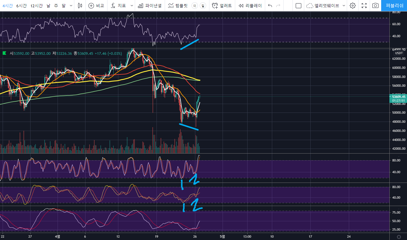 다시 1분봉으로 타임프레임을 낮춰보면 일반 상승다이버전스가 나왔으며,