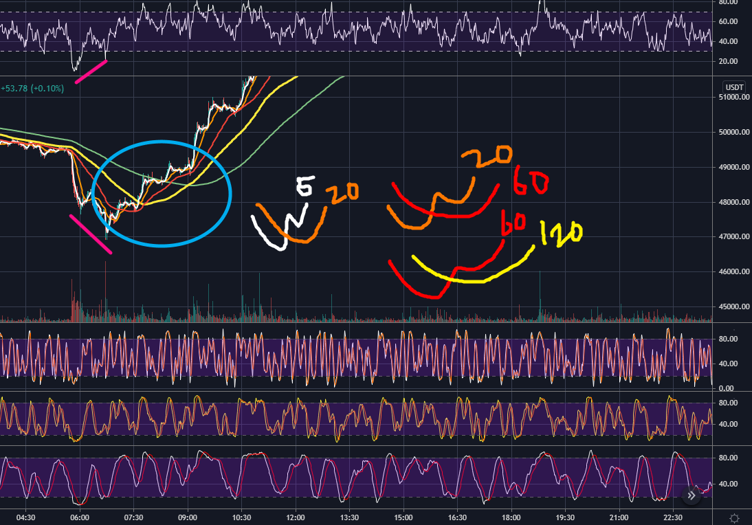 파란색 동그라미 부근에서 하얀색 5이평과 주황색 20이평, 주황색 20이평과 빨간색 60이평, 빨간색 60이평과 하얀색 120이평이 순차적으로 저점을 높이는 쌍바닥을 형성하며 상승한 것을 볼 수 있습니다.