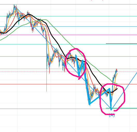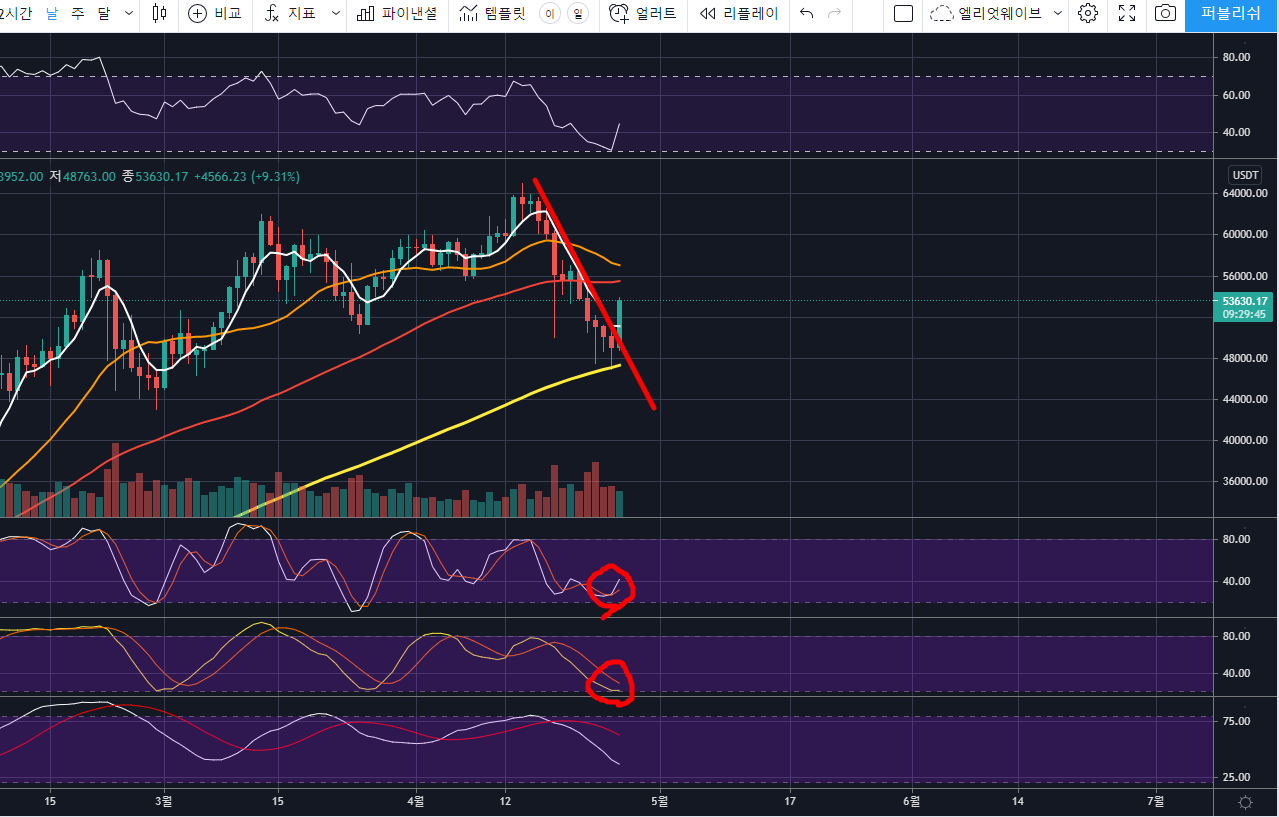 또한 조금 더 하락하게 된다면 노란색 120이평에 닿을 수 있기 때문에, 한 번의 하락파동이 빠르게 일어난 후 빠르게 상승할 것이라 보았습니다. 이렇게 상승한다면 하락추세선을 상향돌파하게 되는 것이고, 상승에 대한 긍정적인 신호가 쏟아져나올 구간이었지요.