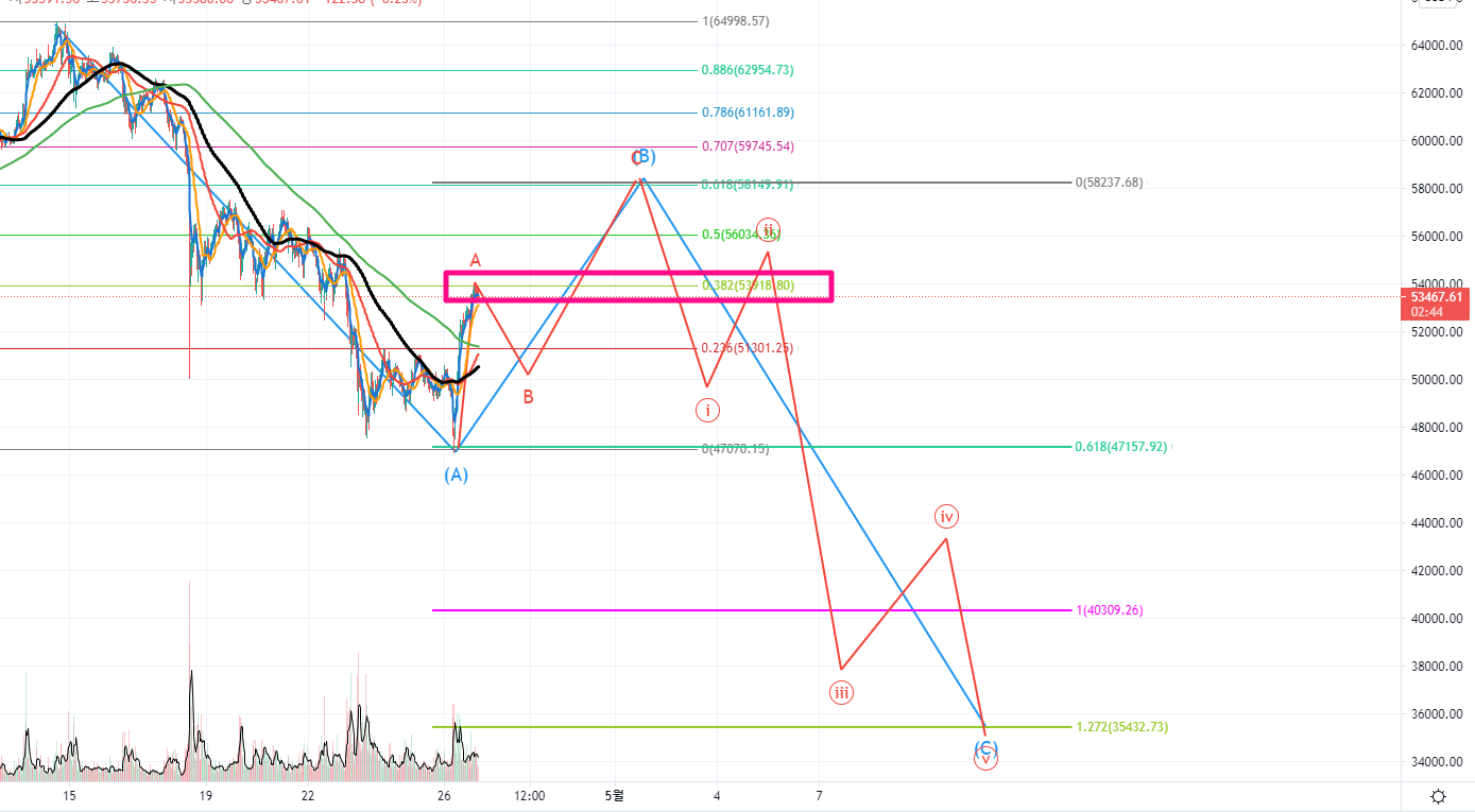 지금 위치에서 상승하게 된다면 엘리엇웨이브 535 ABC로 반등하는 것이 아닐까 싶으며, 현재 아래 차트와 같이 파란색 파동의 하위파동 A파동이 피보나치 0.382되돌림에 저항받고 있는 것으로 보입니다.