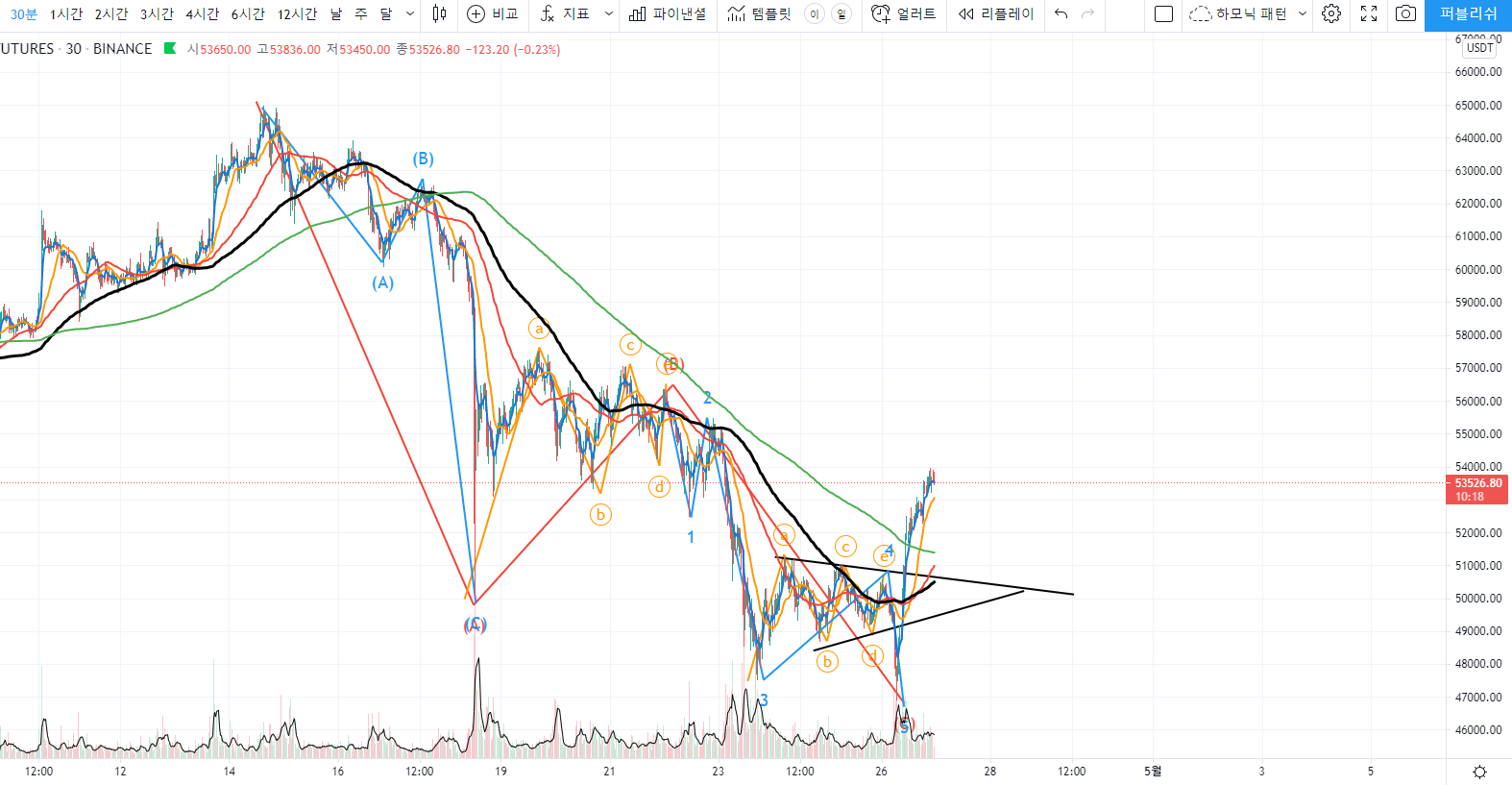 위의 차트대로, 빨간색 ABC 파동이 나온 것으로 보이며 빨간색 C파동의 하위파동 4파동 삼각수렴이 나온 후 하위파동 5파동 하락을 하였습니다. 이렇게해서 빨간색 C파동이 종결된 후 비트코인 가격은 급격한 반등을 하였습니다.