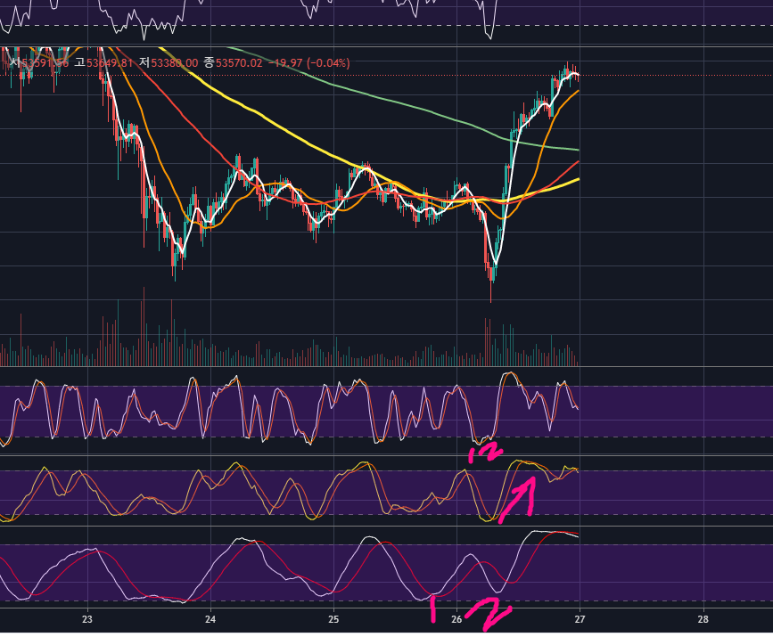 위와 같이 스토캐스틱의 방향이 매우 큰 힌트일 수 있으니 간과하지 마세요.