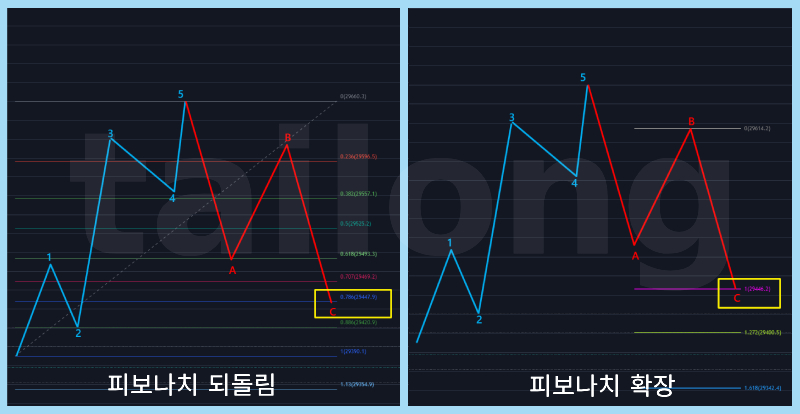 위 그림 좌측처럼 차팅서비스 '트레이딩뷰'에서 피보나치 되돌림과 피보나치 확장 도구를 사용할 수 있고,