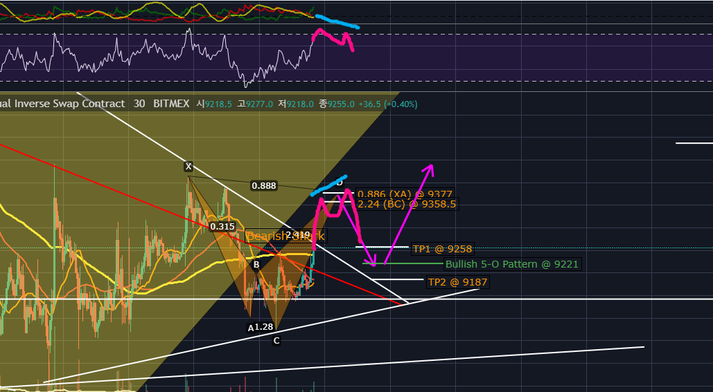그것은 BC projection이 2.24에 해당하며, 이후 Shark Pattern PRZ에서 피보나치 0.5를 되돌리면 Bullish 5-O Pattern의 PRZ에 해당하기도 하고, Shark Pattern의 PRZ에 간다는 것은 하락 추세선을 돌파한다는 것이기에 단기 하락 추세가 종료됨을 의미합니다.