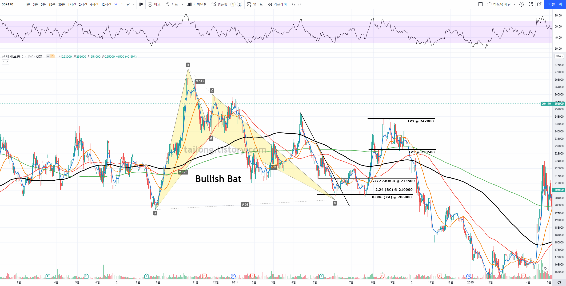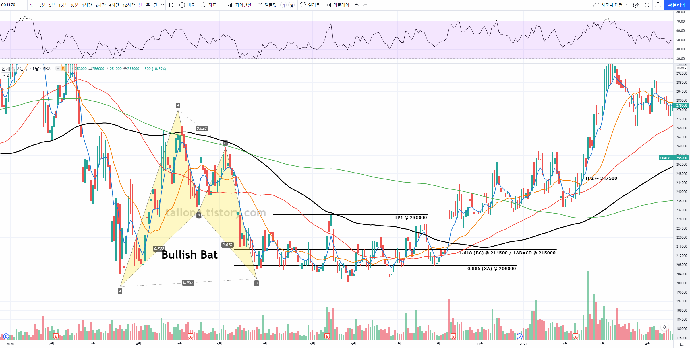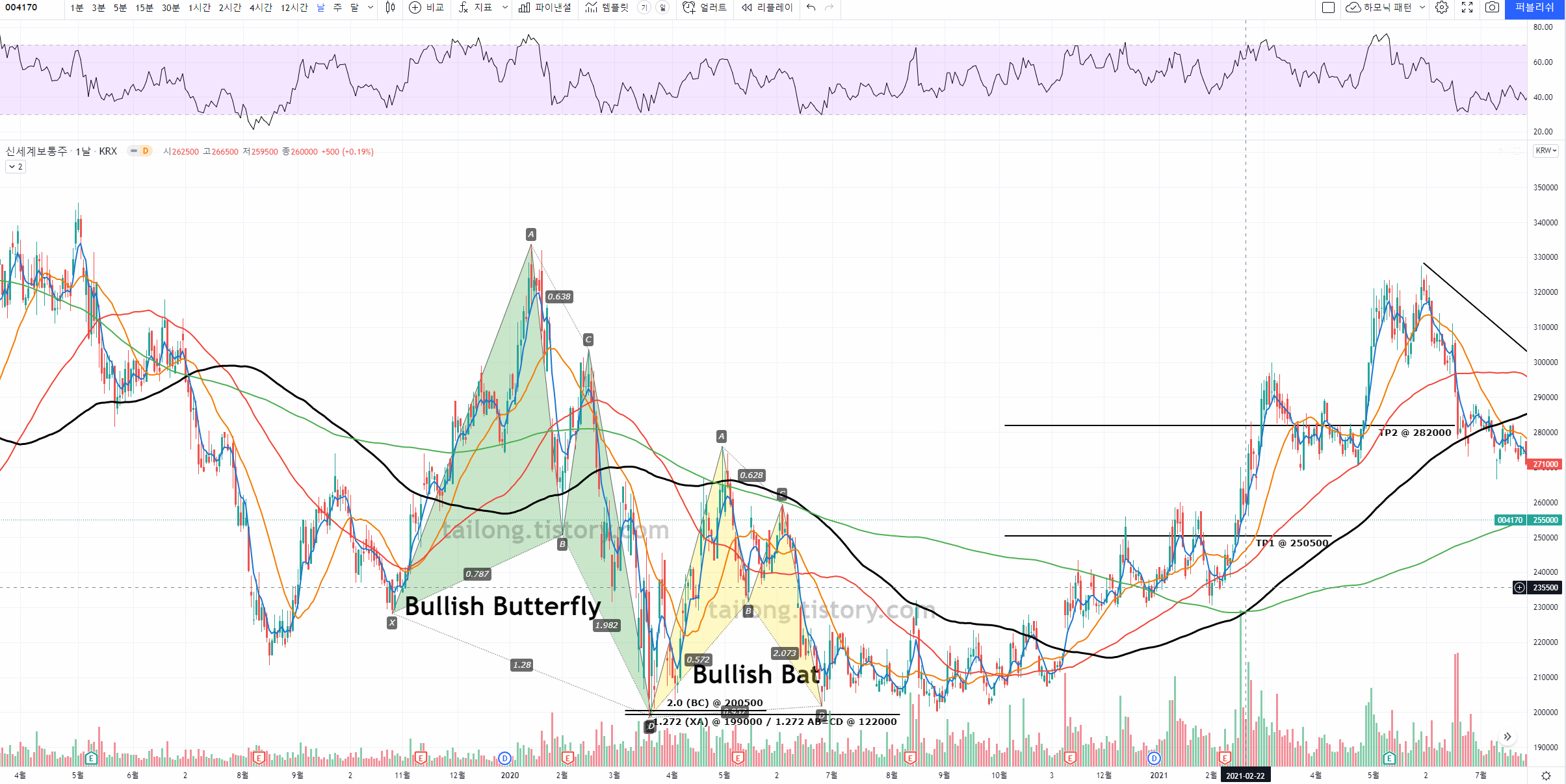 신세계 주가 차트 분석 지난 신세계 주가 분석에서 Bullish Butterfly의 1.27 (XA) PRZ를 도달한 후 상승하는 것을 올렸었습니다. 이후 TP1을 넘어 TP2를 미달하는 상승이 일어날 후 다시 하락하고 있는데