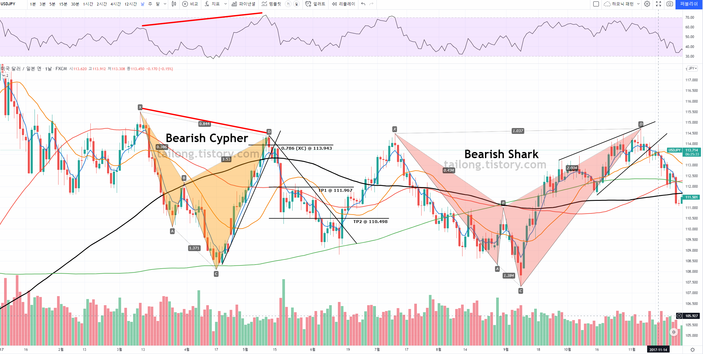 위 그림은 17.07.11~17.11.06 USDJPY 일봉 차트입니다.