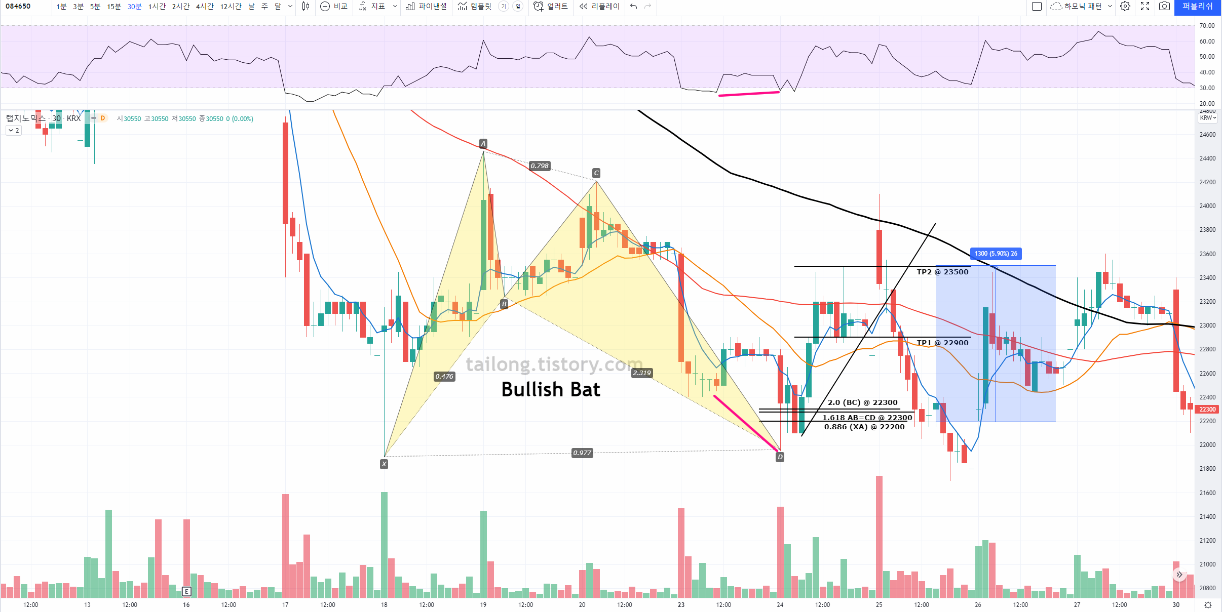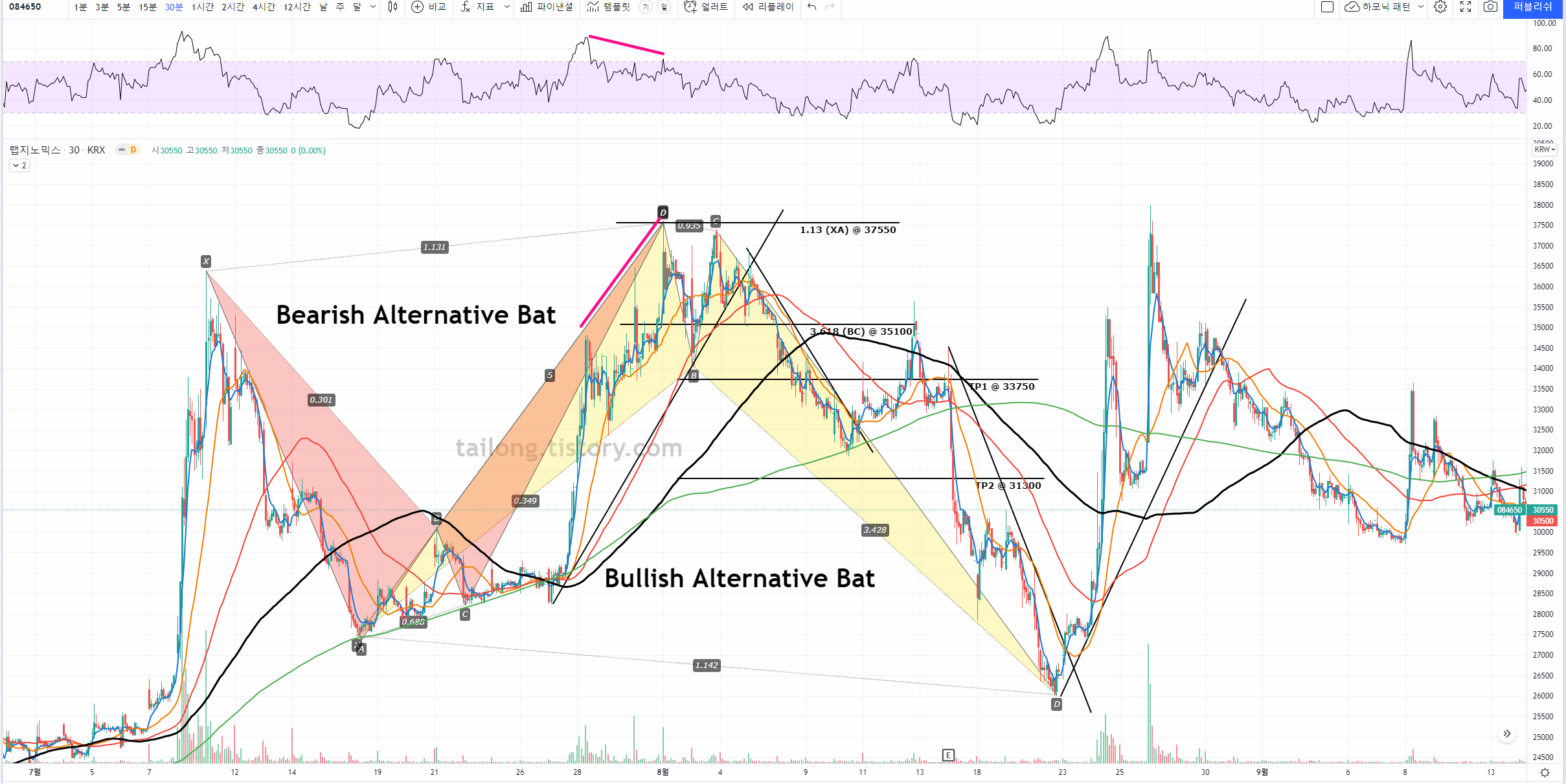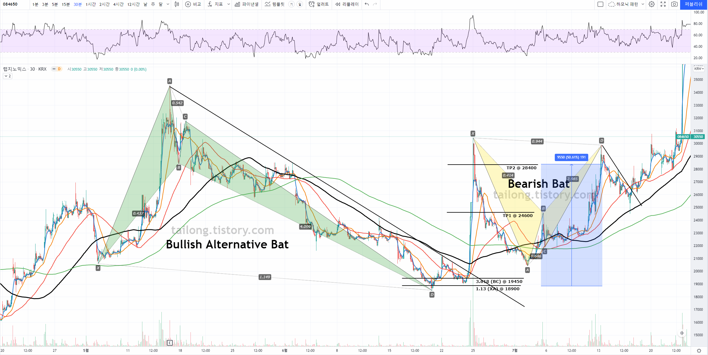 4시간, 일봉의 분석 위주로 되어 있어서, 보다 낮은 타임프레임에서 하모닉 패턴 적용에 대해 문의주시는 분이 있어 30분 봉에 찾은 패턴을 올려드립니다.