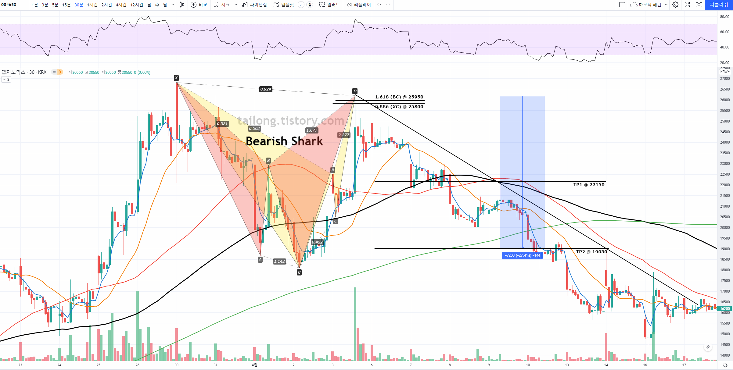 빨간색 Bearish Shark 0.886 D포인트와 1.618 BC Projection 두 가지 PRZ 테스트 후 위꼬리만 캔들로 하락반전한 모습입니다. 노란색 Bearish Bat과 PRZ가 겹치면서 하락반전에 대한 신뢰도를 높여줬네요. D포인트에서 TP2까지 조정을 준 곳의 가격하락폭은 27%입니다. 꽤나 큰 하락을 했네요.
