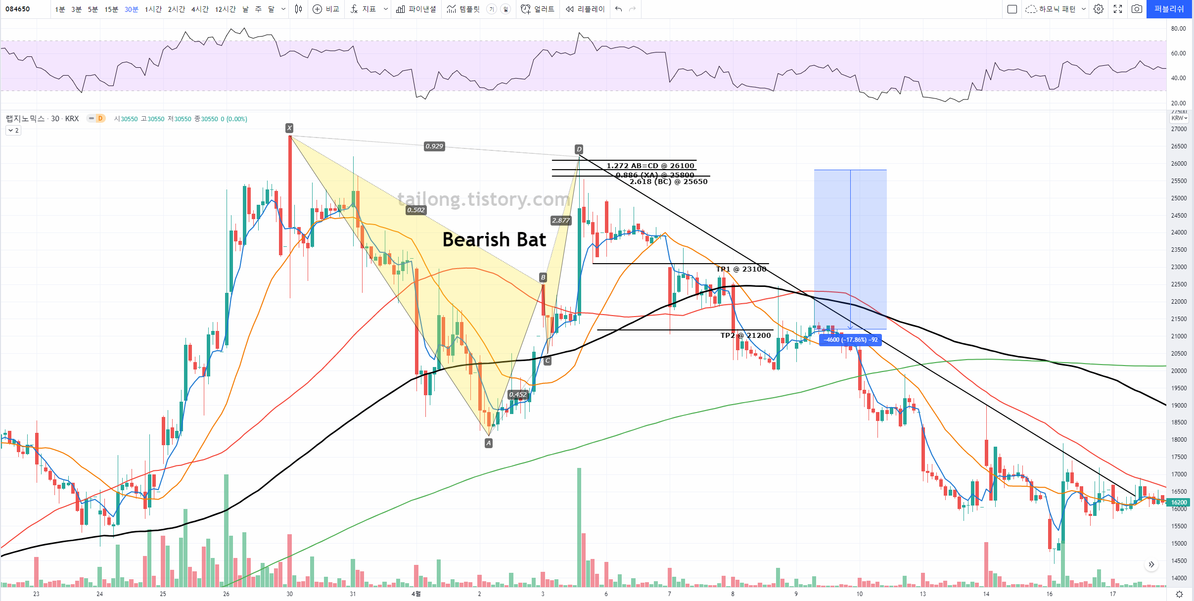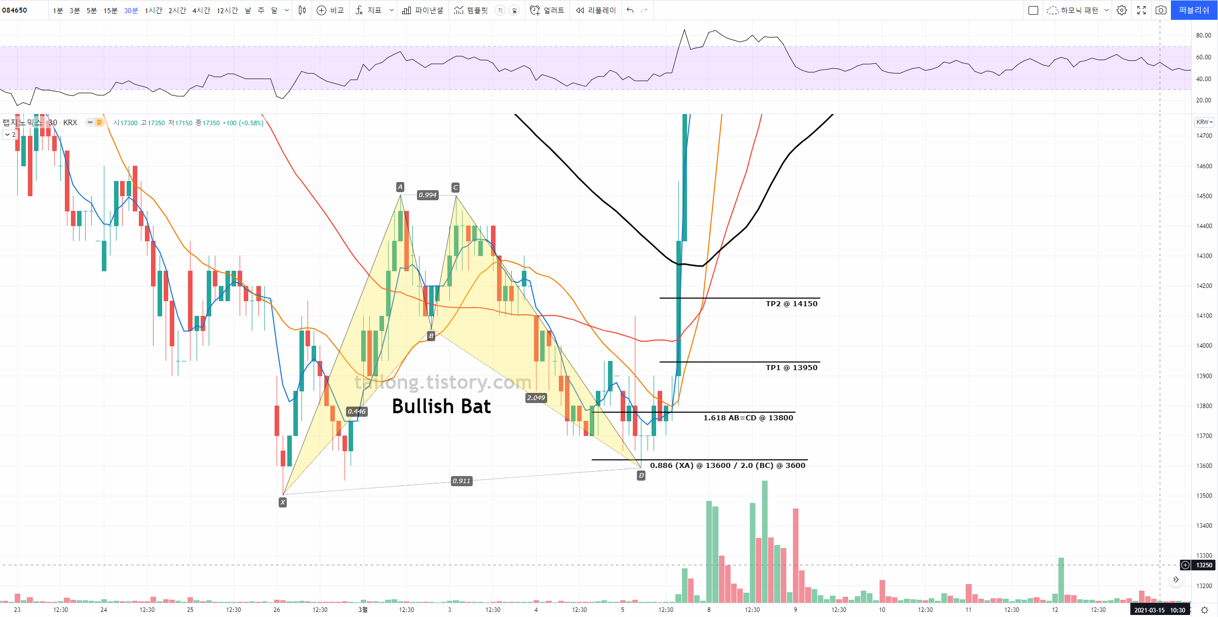 이 게시판의 글은 주식 종목에서 하모닉 패턴이 어떻게 사용되는지 예시를 올려 향후 하모닉 패턴을 공부하고 매매에 활용함에 있어 도움을 주고자 하는 것에 의의가 있으며, 제 전자책과 블로그 홍보에도 활용됩니다.