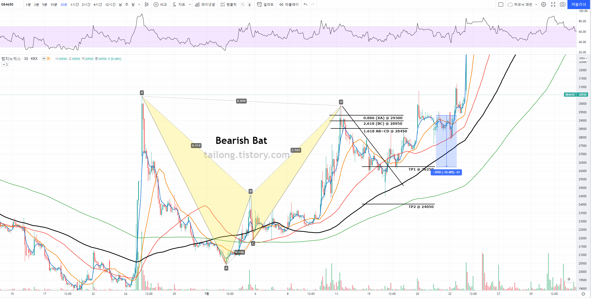 4시간, 일봉의 분석 위주로 되어 있어서, 보다 낮은 타임프레임에서 하모닉 패턴 적용에 대해 문의주시는 분이 있어 30분 봉에 찾은 패턴을 올려드립니다.