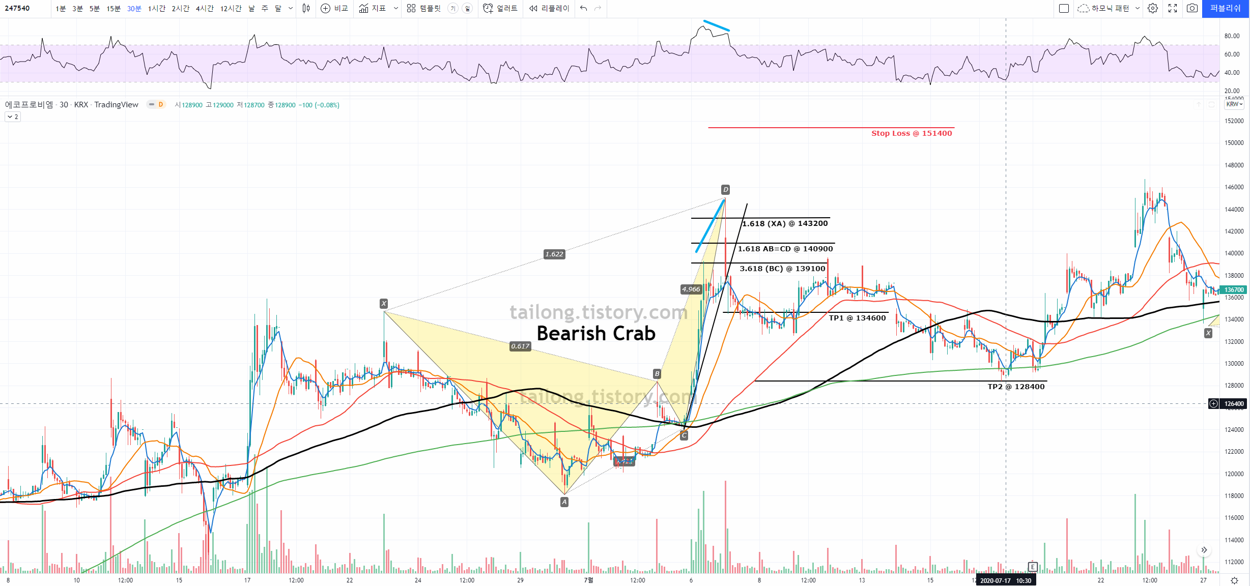 Bearish Crab Pattern 1.618 D포인트, 3.618 BC Projection, 1.618 AB=CD 세 가지 PRZ 테스트 후 RSI 일반 하락다이버전스가 나오며 하락반전하였습니다. 하락시 상승추세선을 하향이탈하며, 위꼬리단 음봉캔들로 하락반전을 명확히 확인할 수 있었네요. TP2까지 조정을 준 후 재차 상승한 모습입니다.