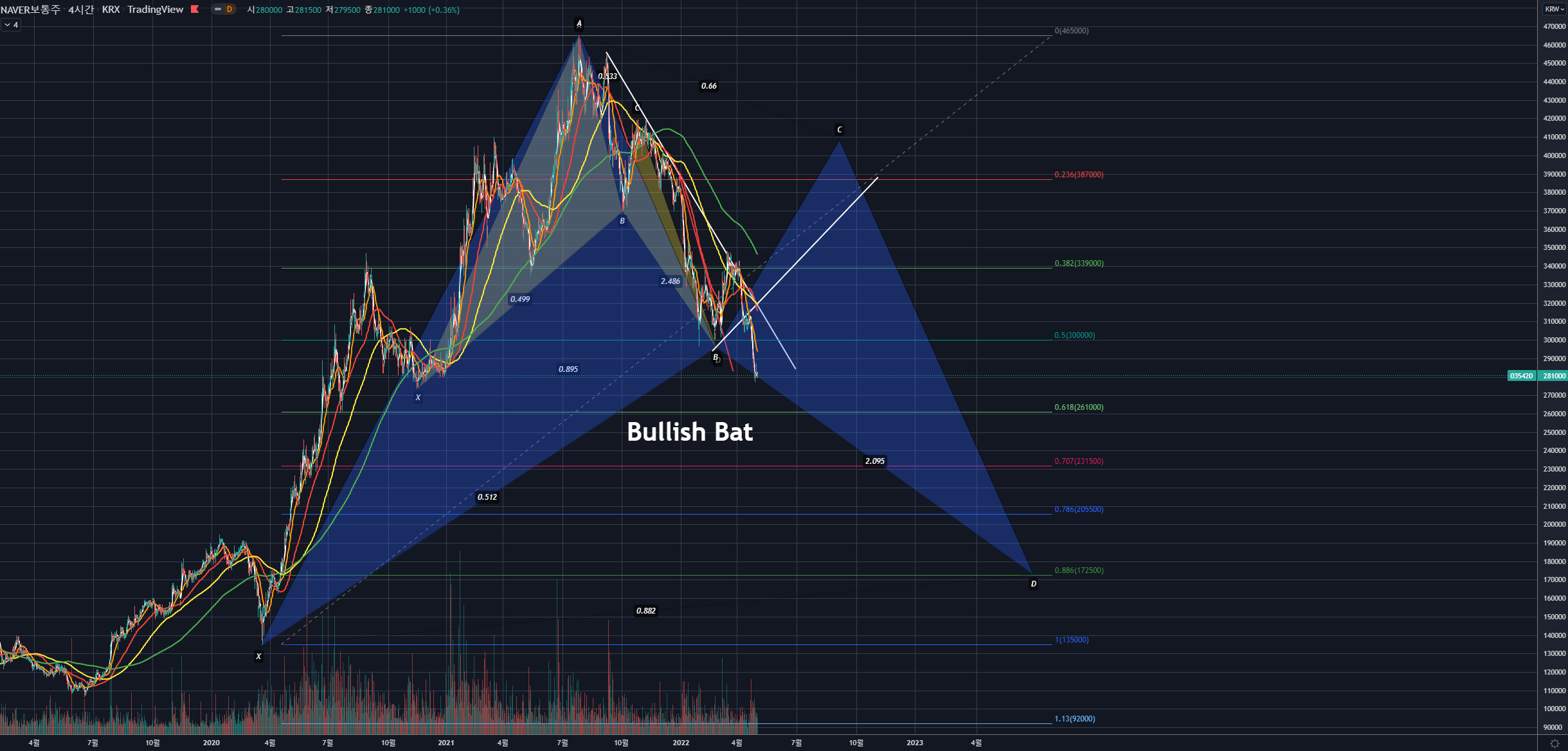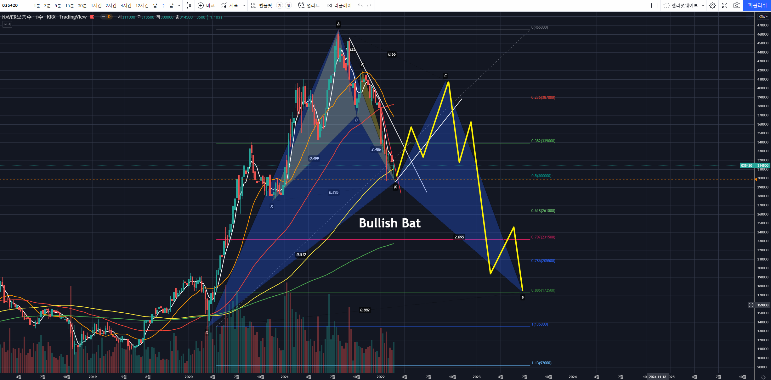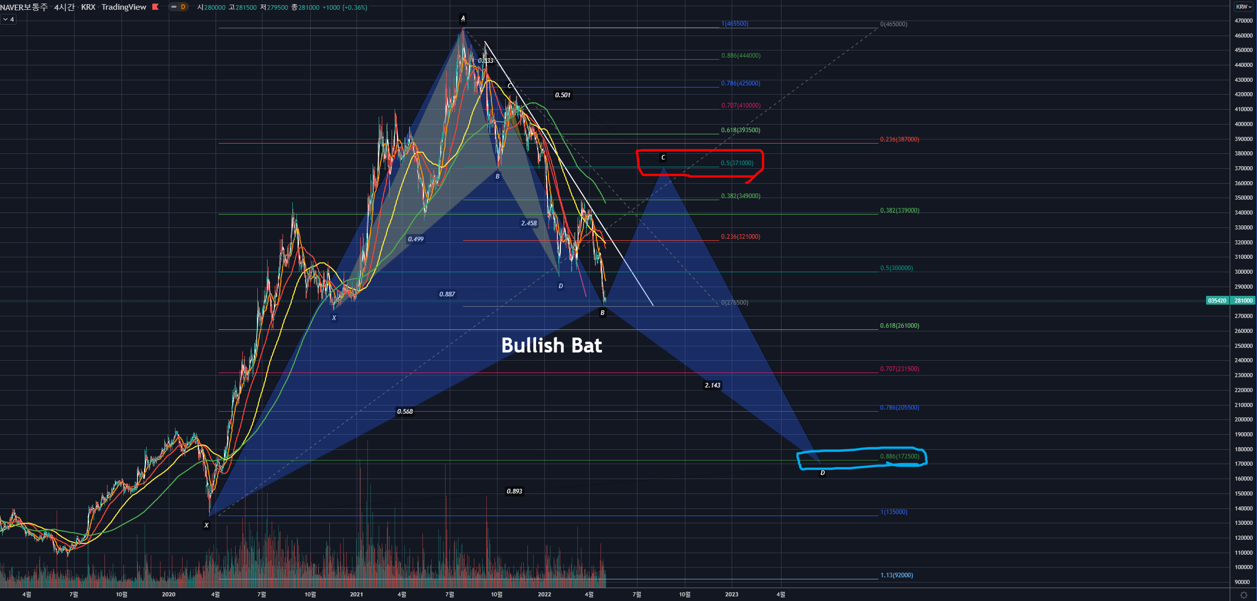 위의 차트와 같이, 파란색의 새로운 Bullish Bat의 B포인트를 생각하고 시나리오를 만들어볼 수 있겠습니다.