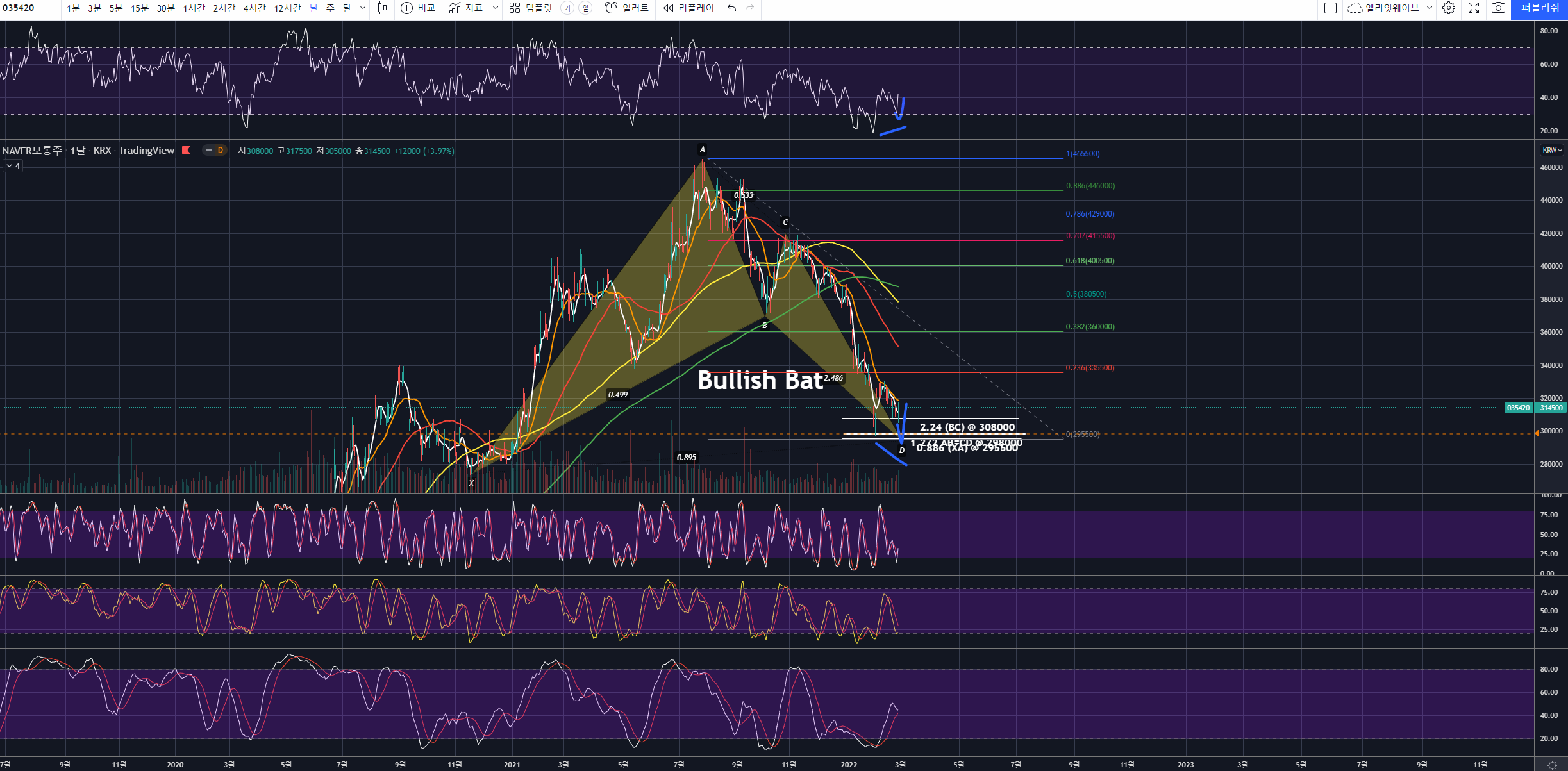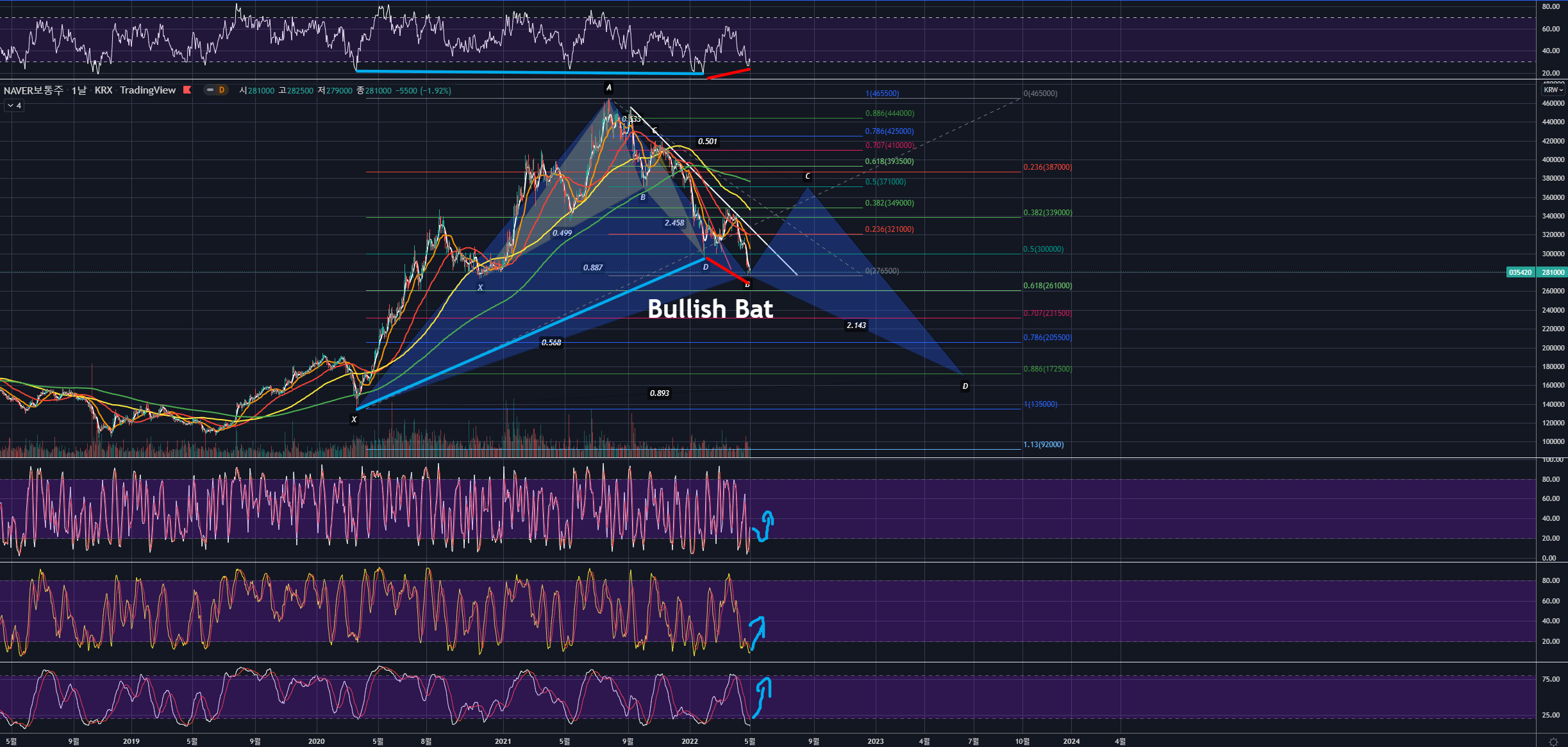 파란색 RSI 히든 상승 다이버전스, 빨간색 RSI 일반 상승다이버전스가 있어 상승반전할 것이며, 이때 스토캐스틱 533,1066, 201212가 모두 우상향하겠네요. 이렇게 상승한다고 하더라도 파란색 Bullish Bat의 C포인트로 보이는 곳에서 RSI 히든 하락다이버전스가 나오며 하락할 수 있으니 꼭 추적해가면 매매하길 바랍니다.