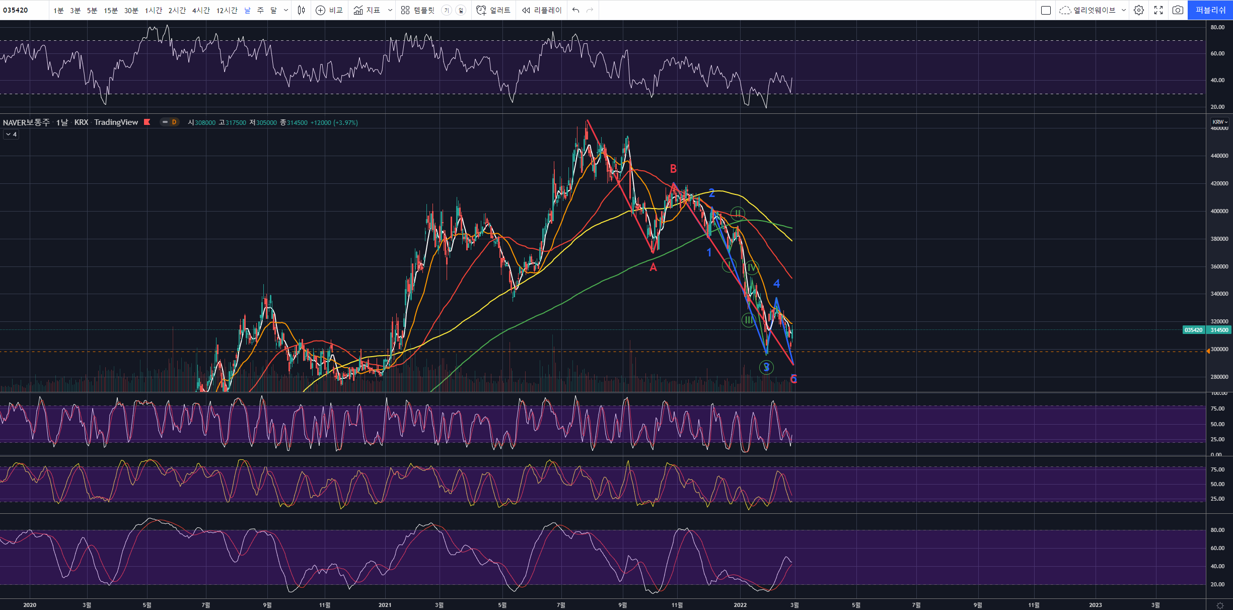 네이버의 주가가 ABC 조정의 C-5파가 나오고 있는 것으로 보입니다. 원래는 저점을 낮추면서 일봉상 RSI 일반 상승다이버전스가 나왔어야 하지만, 나스닥의 급격한 반등으로 인해 C-5파가 절단된 것이 아닐까도 싶네요.