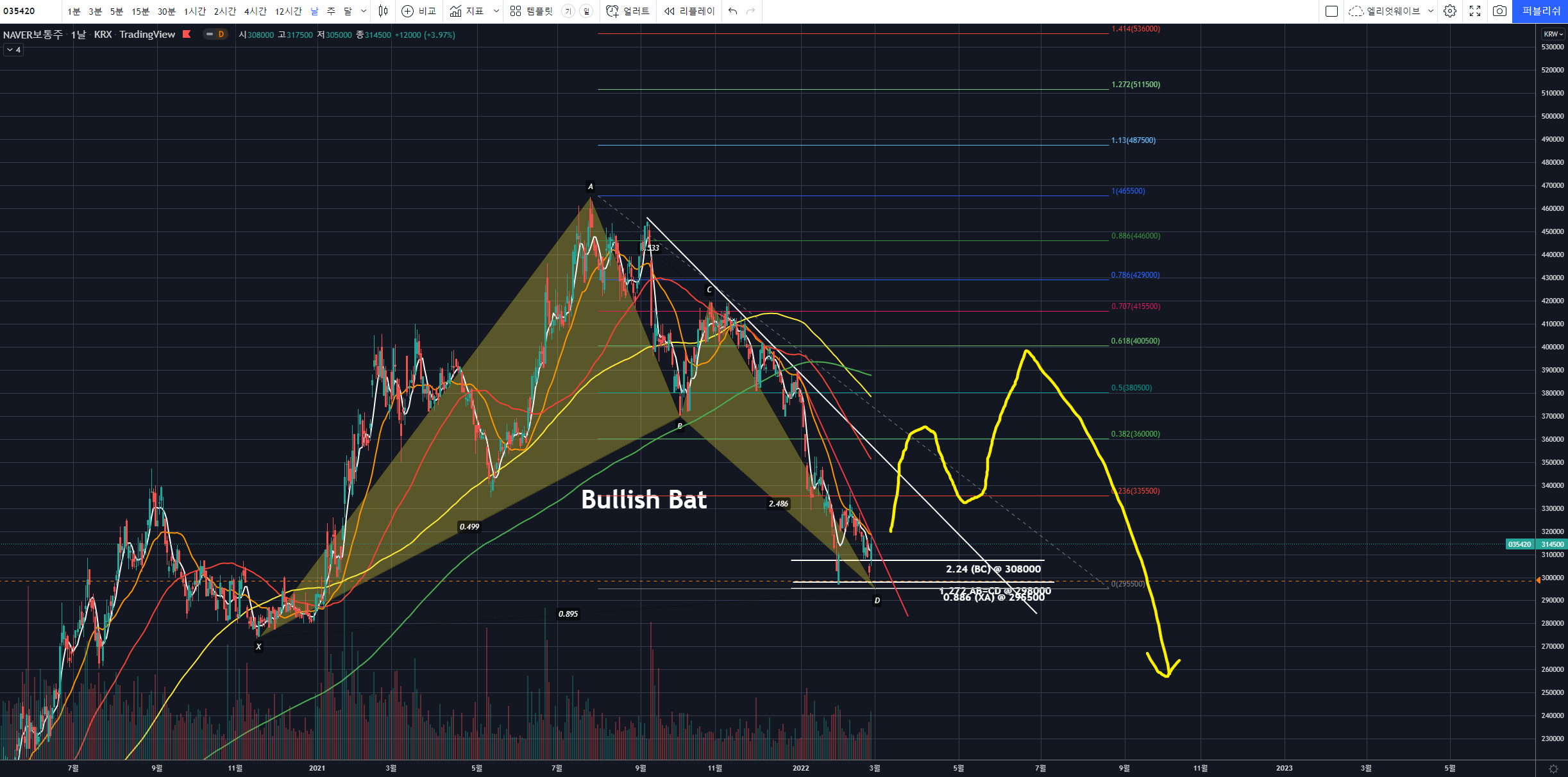 만약 이구간에서 반등 후 피보나치 0.5~0.618 부근에서 저항을 맞고 하락한다면, 파란색 Bullish Bat의 PRZ까지 하락을 염구하는 것이 좋아보입니다.