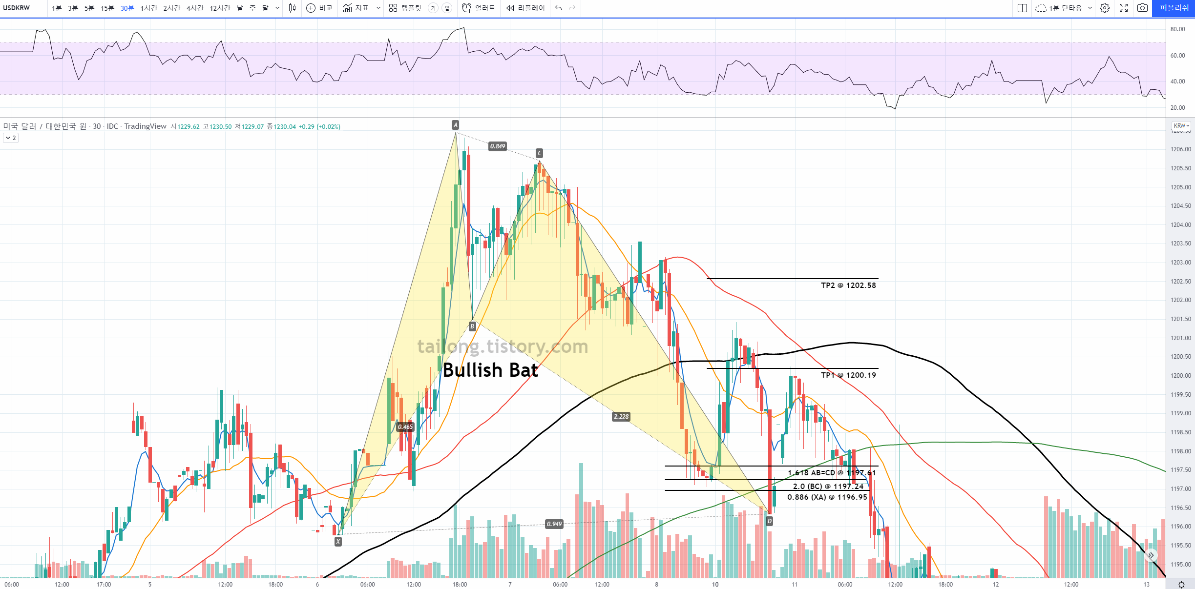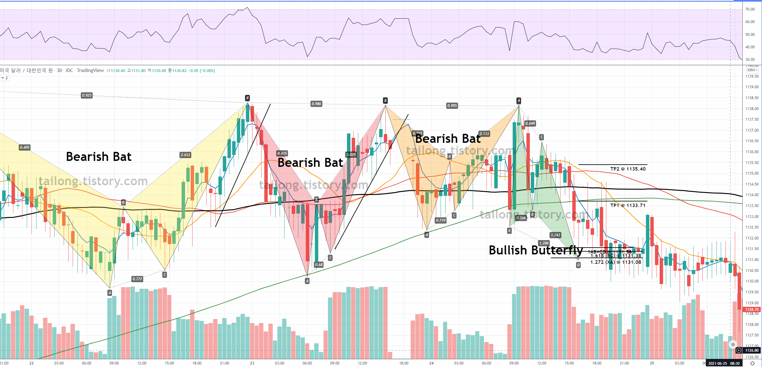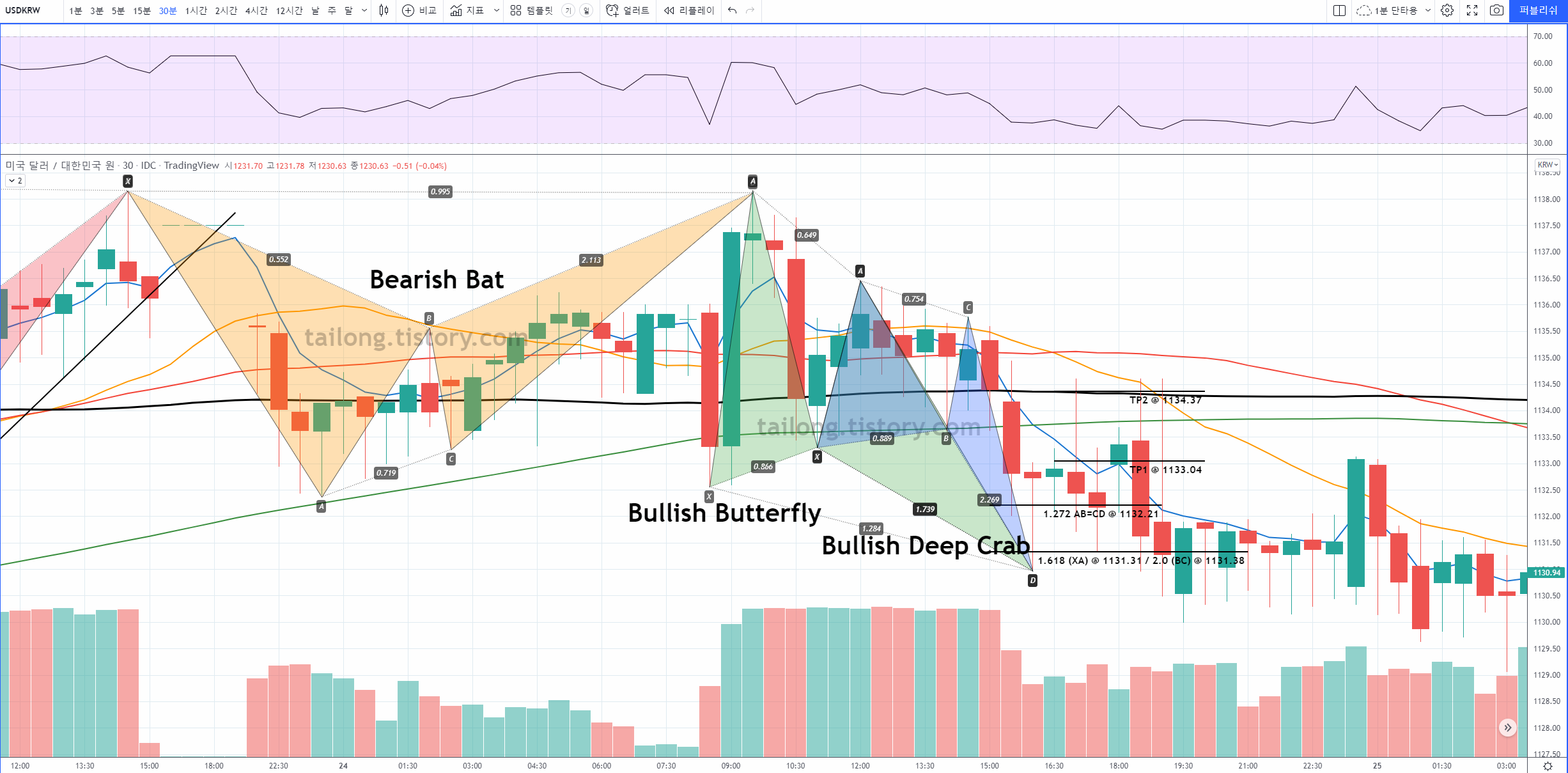 원달러 30분 봉에서 하모닉 패턴을 찾아보았습니다. 30분 봉에서 패턴이 보여도, 1분과 5분에서 반전 근거가 명확히 나오는 경우가 있으니, 반드시 진입과 청산시에는 하위 타임프레임과 상위 타임프레임을 확인하시길 바랍니다.