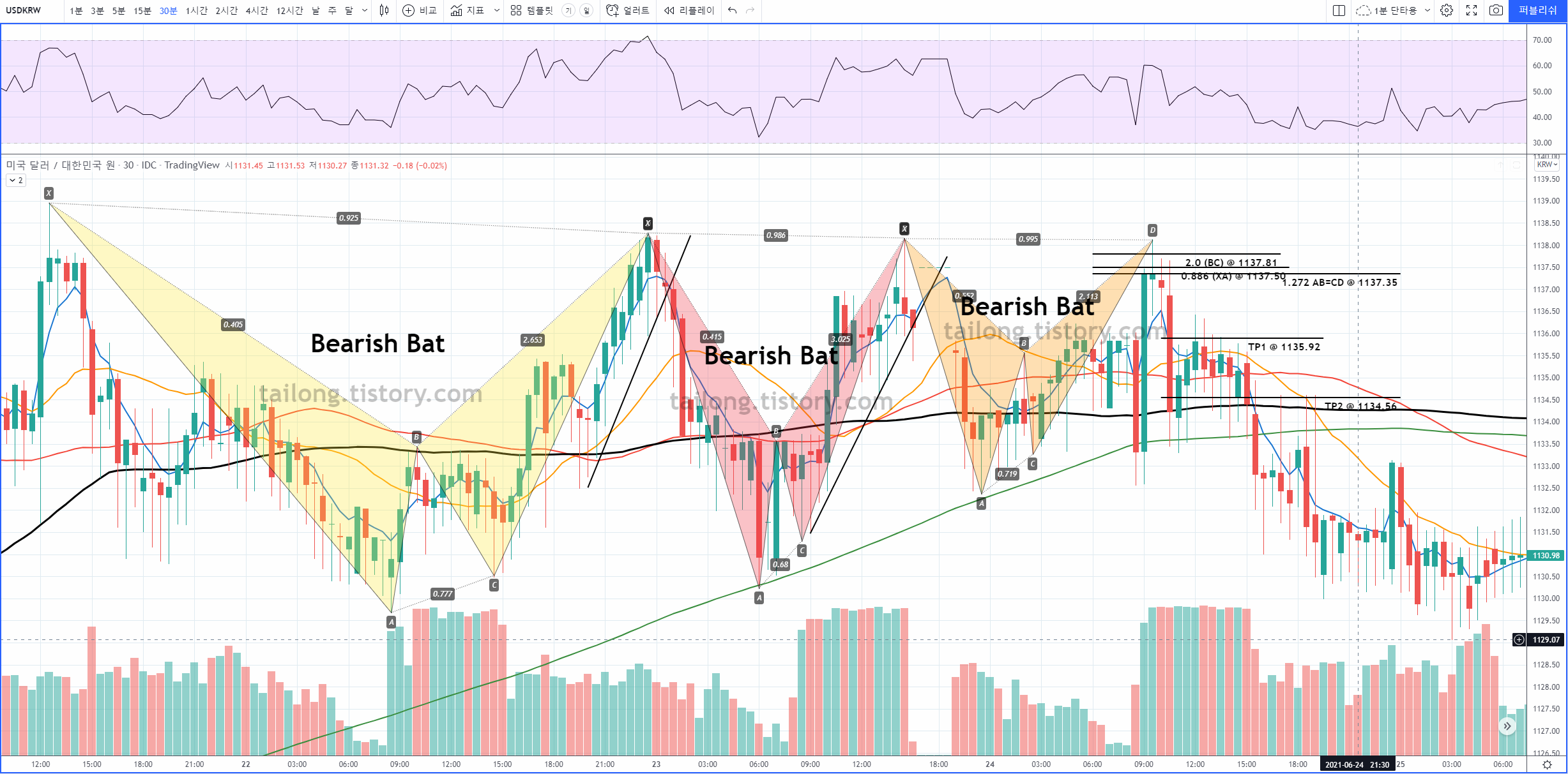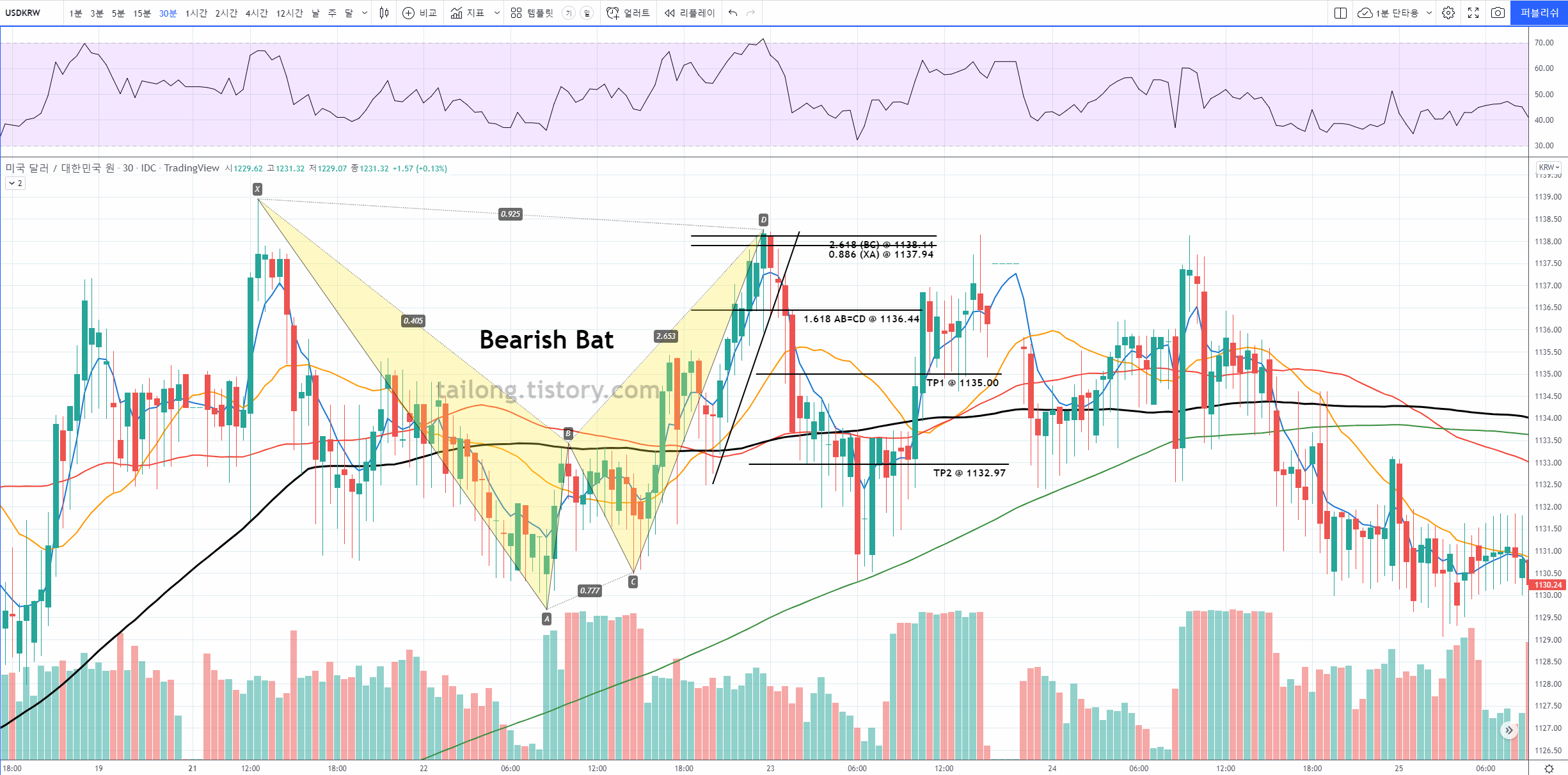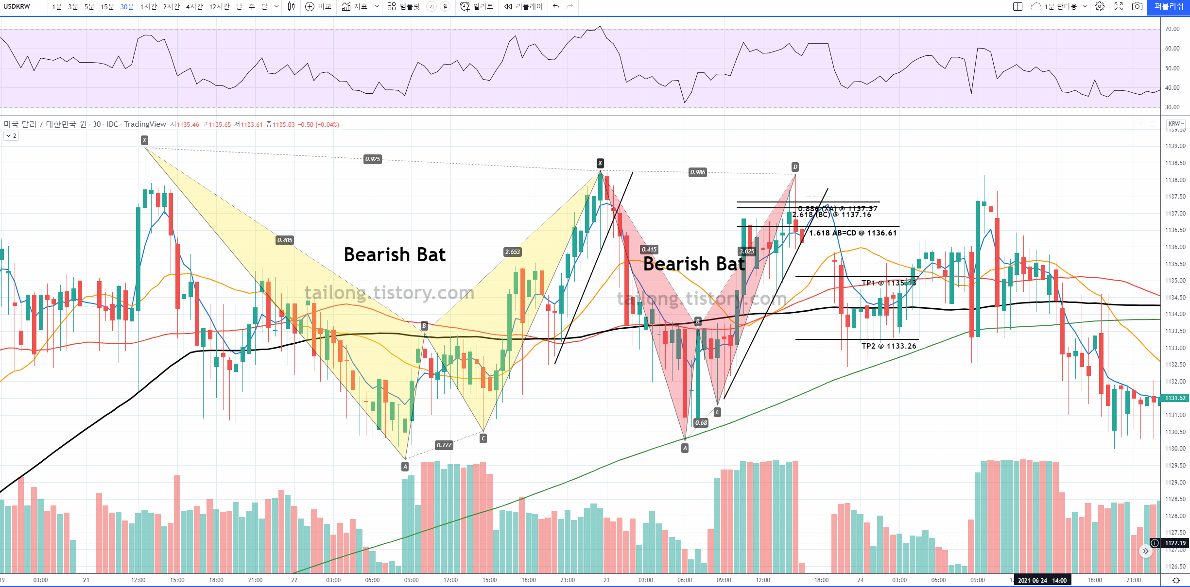 원달러 30분 봉에서 하모닉 패턴을 찾아보았습니다. 30분 봉에서 패턴이 보여도, 1분과 5분에서 반전 근거가 명확히 나오는 경우가 있으니, 반드시 진입과 청산시에는 하위 타임프레임과 상위 타임프레임을 확인하시길 바랍니다.