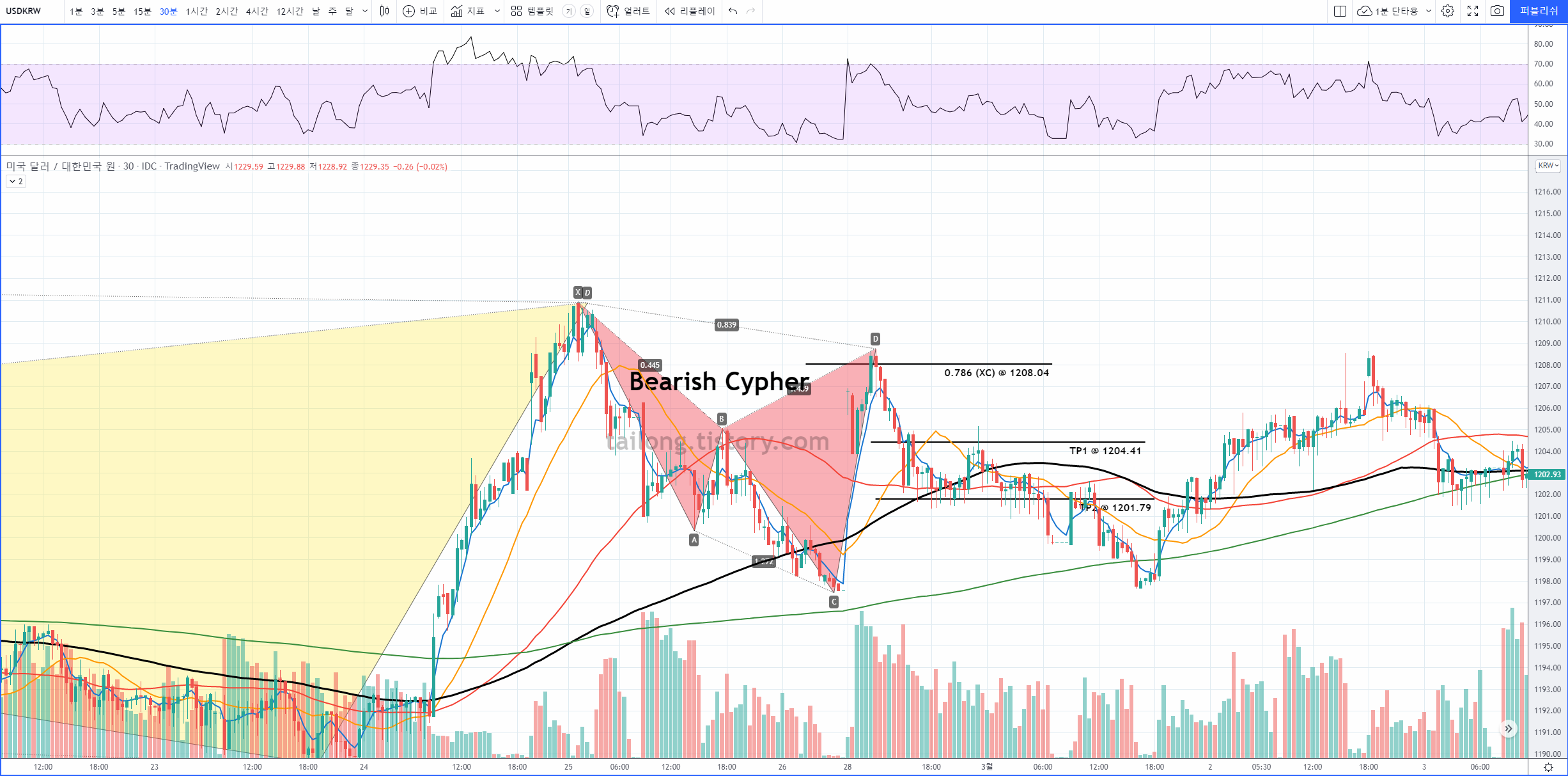 위 그림은 22.01.28~22.02.26 원달러 30분 봉 차트입니다.