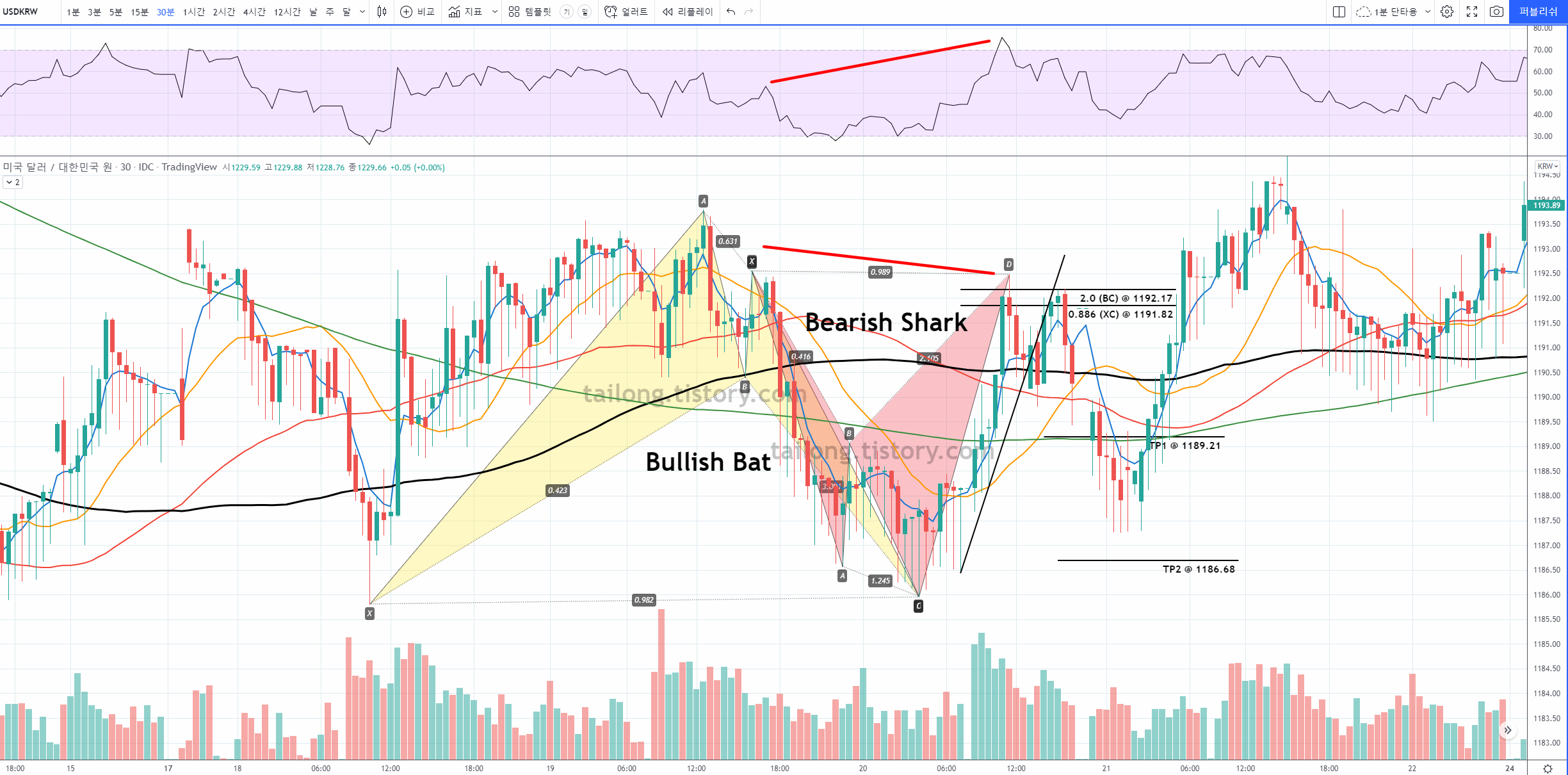 Bearish Bat 0.886 D포인트, 2.618 BC Projection, 1.618 AB=CD 세 가지 PRZ 테스트 후 빨간색 RSI 히든 하락다이버전스 적용 후 하락반전하였습니다. TP2까지 무난히 하락하였으며, 이후 장대양봉이 나오며 다시 상승하였네요.