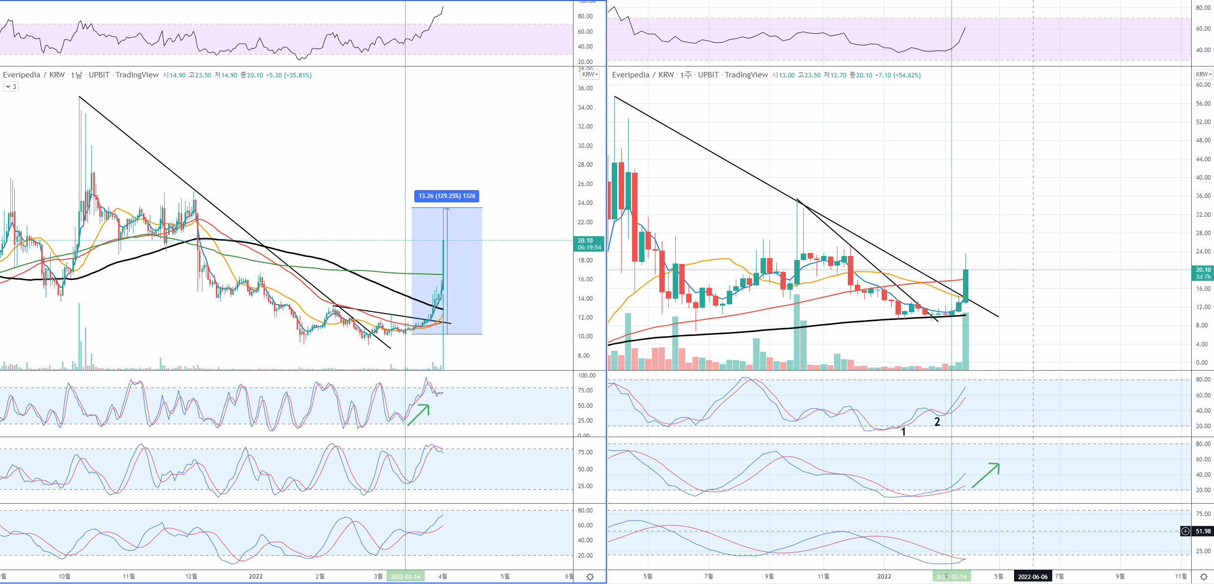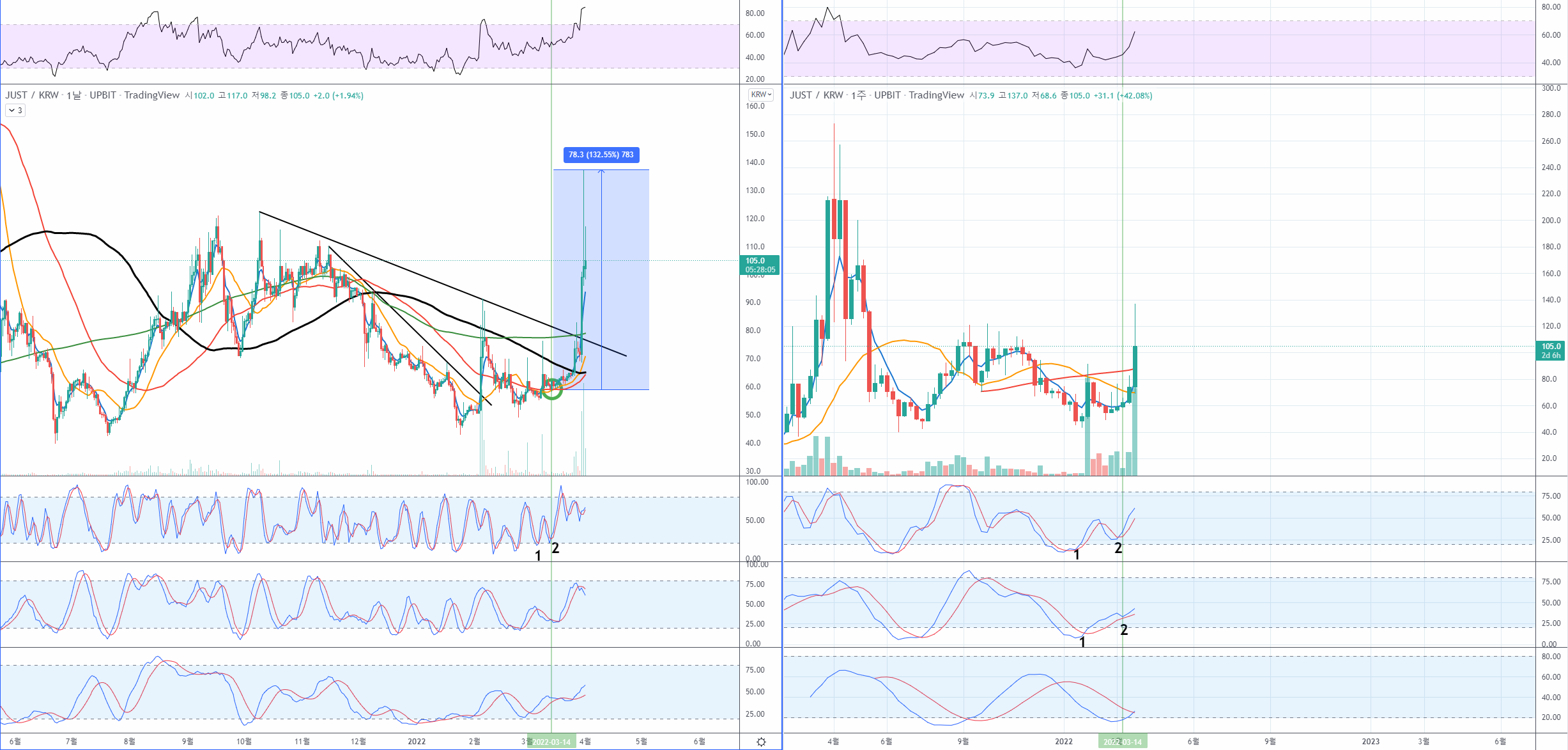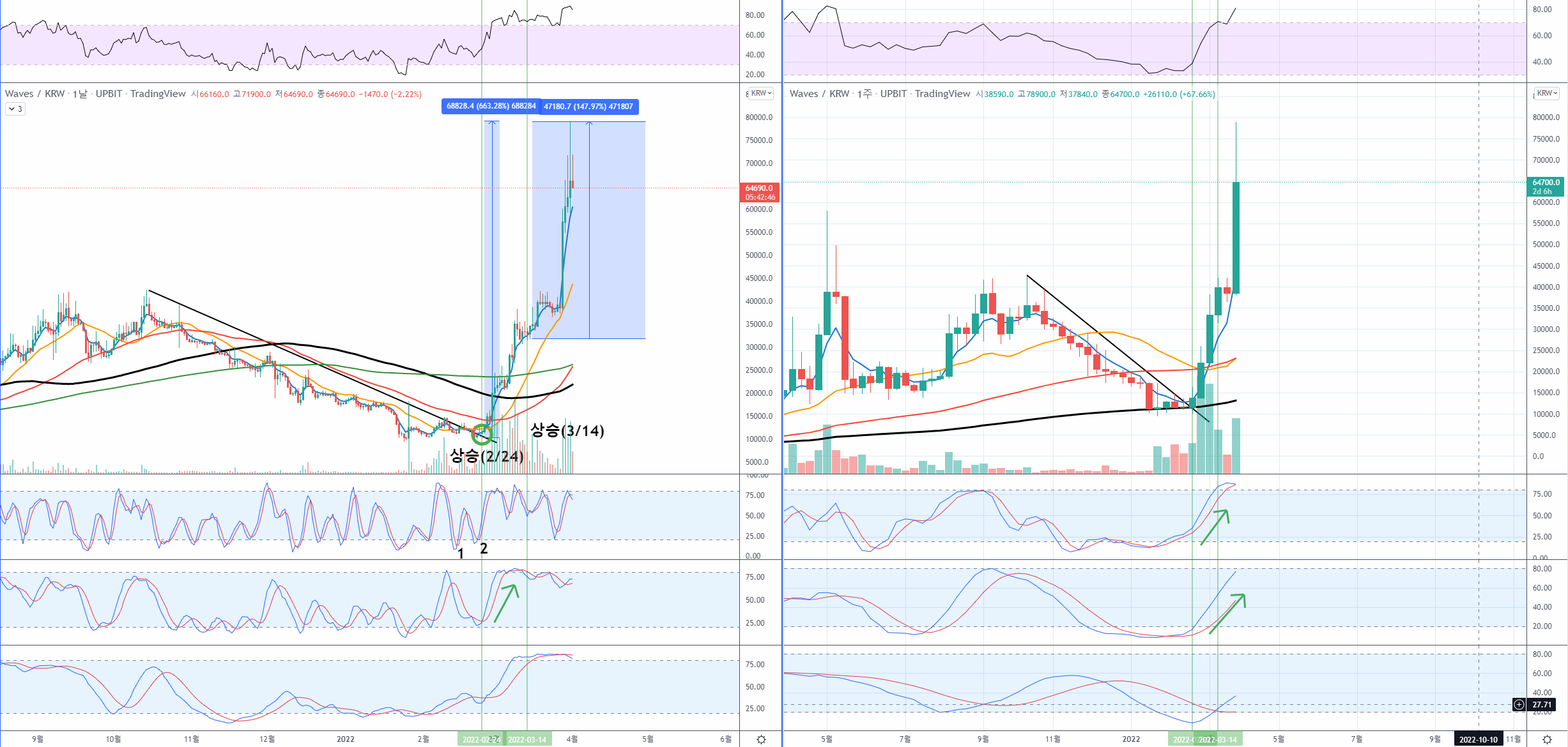 2월 24일 하락추세선을 상향돌파하였으며, 일봉 533 저점을 높이는 쌍바닥, 1066 골든크로스, 201212 골든크로스 임박이 보이며 주봉 또한 533이 우상향 중이었고, 1066이 골든크로스가 나왔습니다. 이후 장대양봉으로 아주 큰 상승이 나왔으며, 비트코인/나스닥과 다른 알트코인의 큰 상승을 보인 3월 14일 저점에서 상승세를 이어갔습니다.