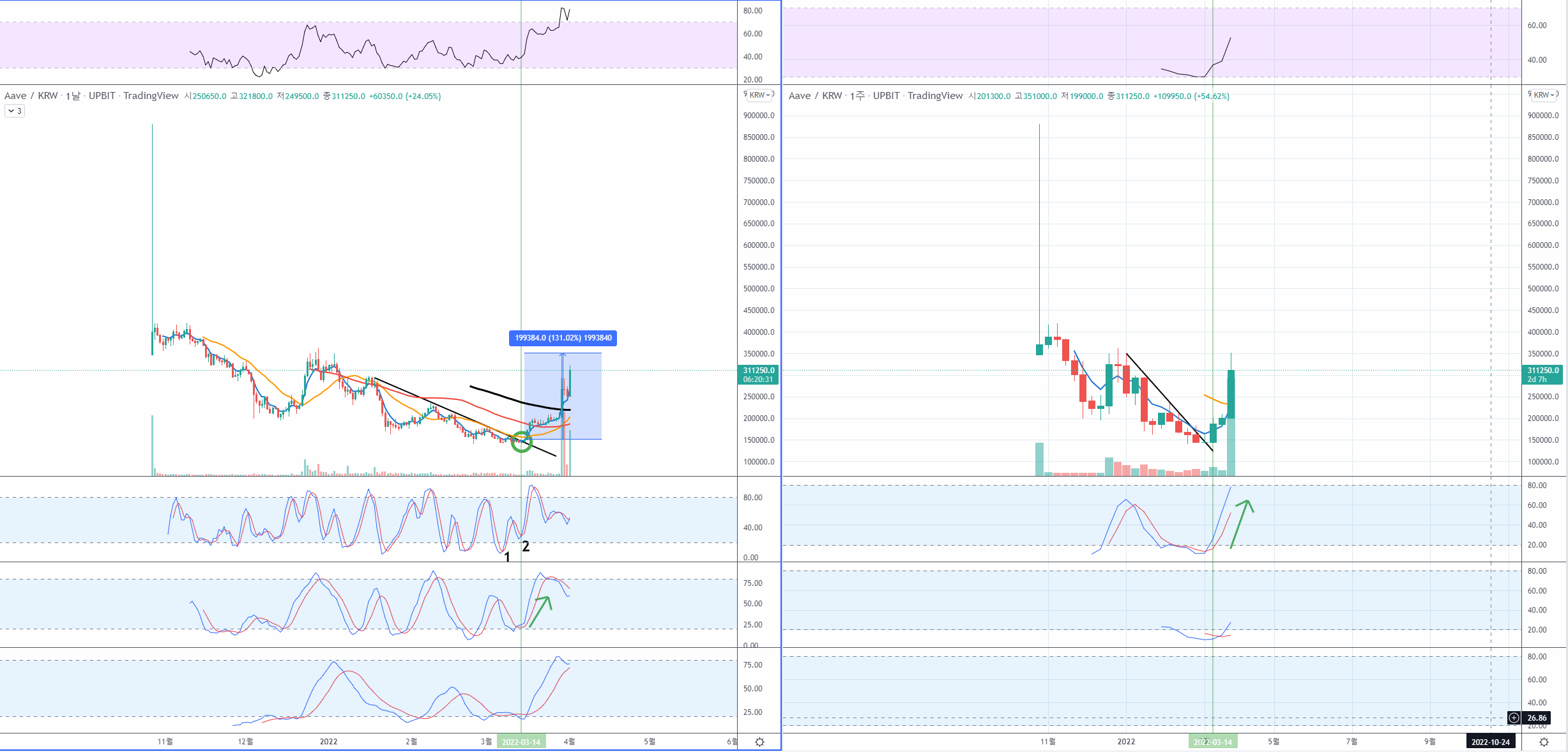 위의 에이브 또한 좌측 일봉차트에서 533 저점을 높이는 쌍바닥, 1066 골든크로스가 나오며 하락추세선을 상향돌파했고, 이평선의 정배열이 나오면서 상승했네요. 이때 주봉 533이 우상향하고 장대양봉이 나오며 상승세가 두드러졌습니다. 1066도 골든크로스 임박한 상태였고, 현재는 골든크로스 상태네요. 최근 3/30일에 일봉에서 RSI 과매수권에 진입했었기에 비트코인/나스닥의 하락과 더불어 위꼬리가 달리며 하락한 모습입니다. 이는 다른 알트코인도 대부분 동일할 것입니다.