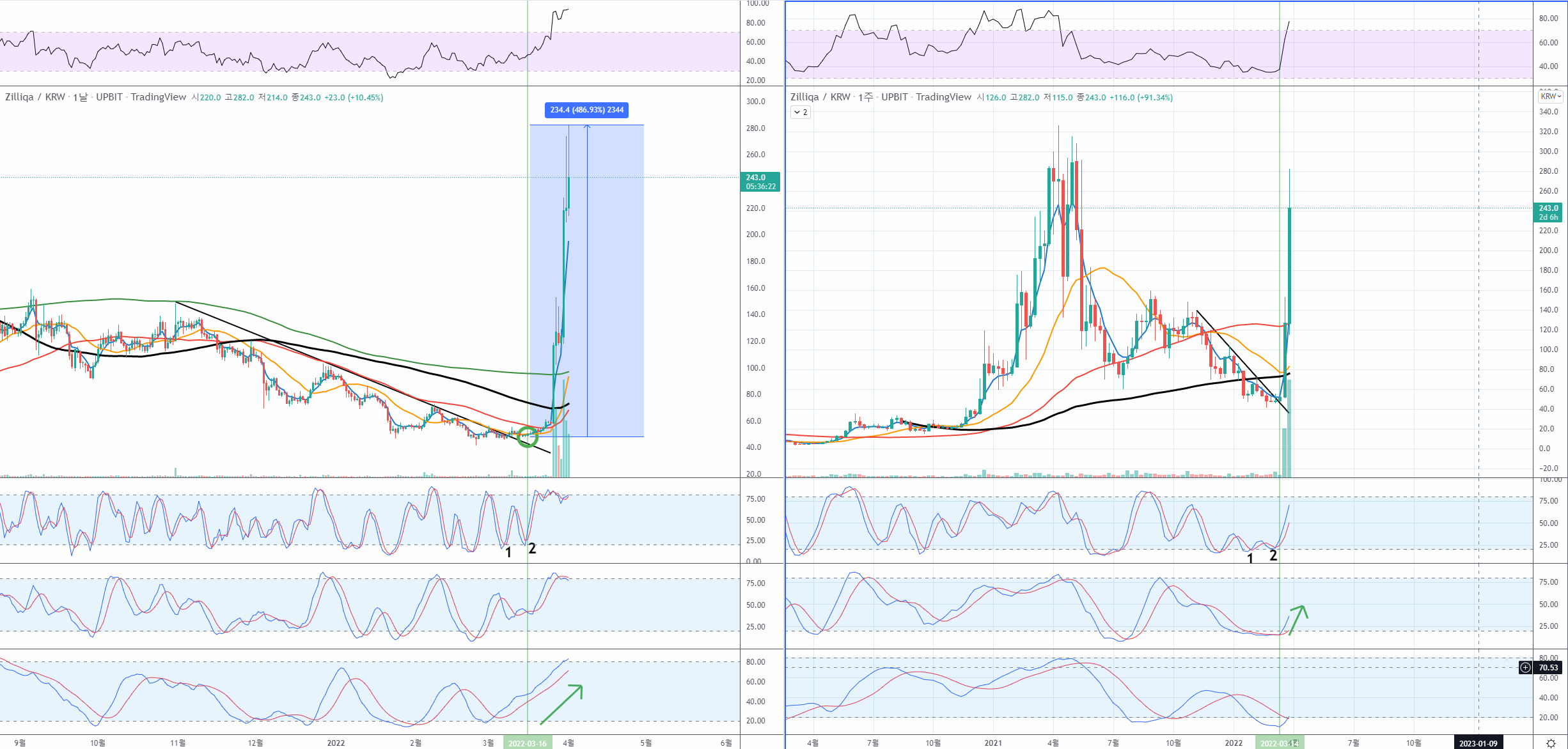 위의 질리카 차트를 보면, 좌측 일봉에서 하락추세선을 상향돌파한 후, 533 저점을 높이는 쌍바닥, 201212 우상향으로 상승을 시작한 것이 보입니다. 또한 상승 후 이평선의 정배열이 일어났으며, 주봉 또한 같은 기간에 533의 저점을 높이는 쌍바닥, 1066의 골든크로스, 201212 골드크로스 임박이 보입니다. 비트코인은 알트코인의 지수와 유사하며, 이와 함께 글로벌 시장의 제일 중요한 지수인 나스닥을 지켜보며 큰 상승과 큰 하락자리에서 먼저 오를만한(차트가 좋은) 알트코인을 선별 후 진입한다면 비교적 큰 수익을 얻을 수 있습니다.