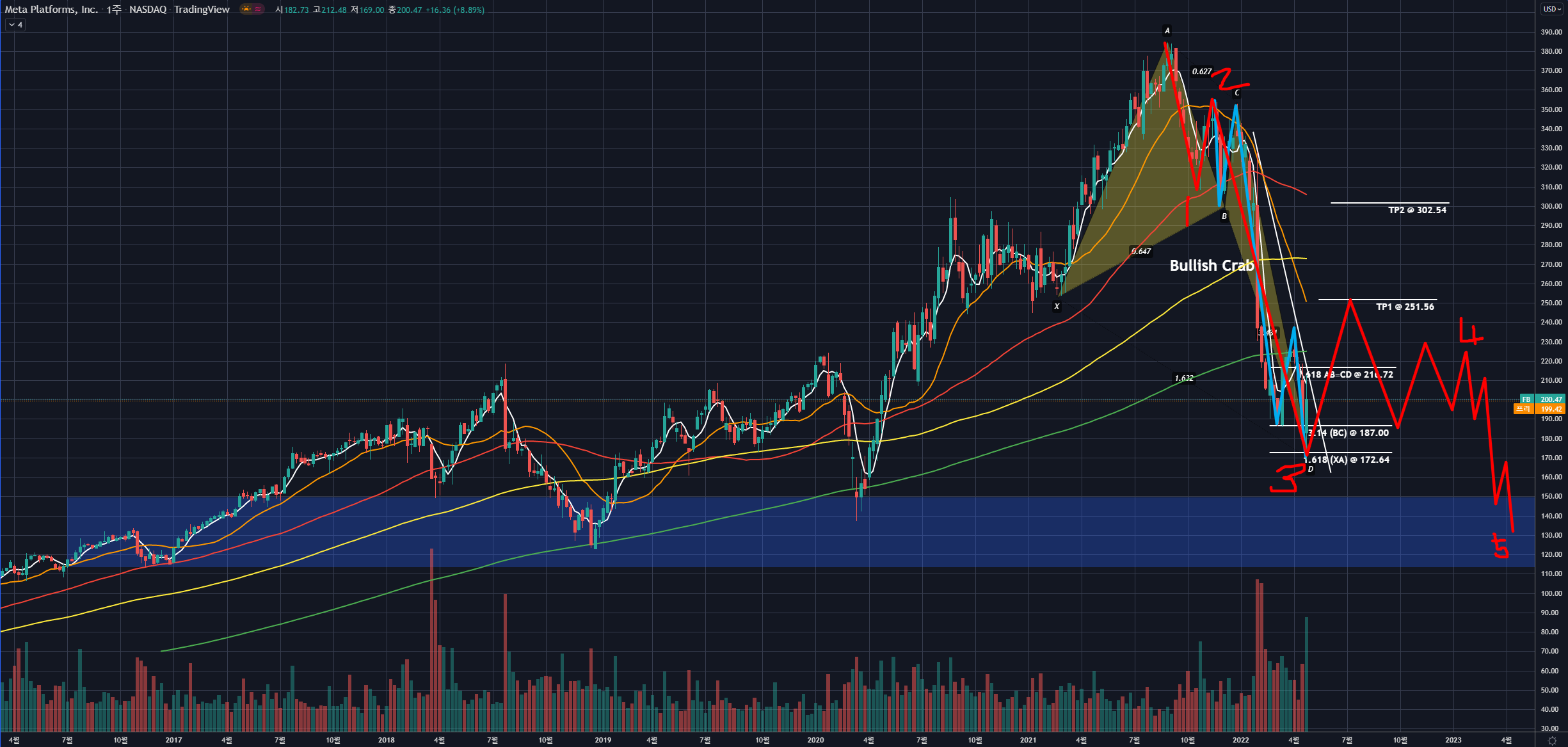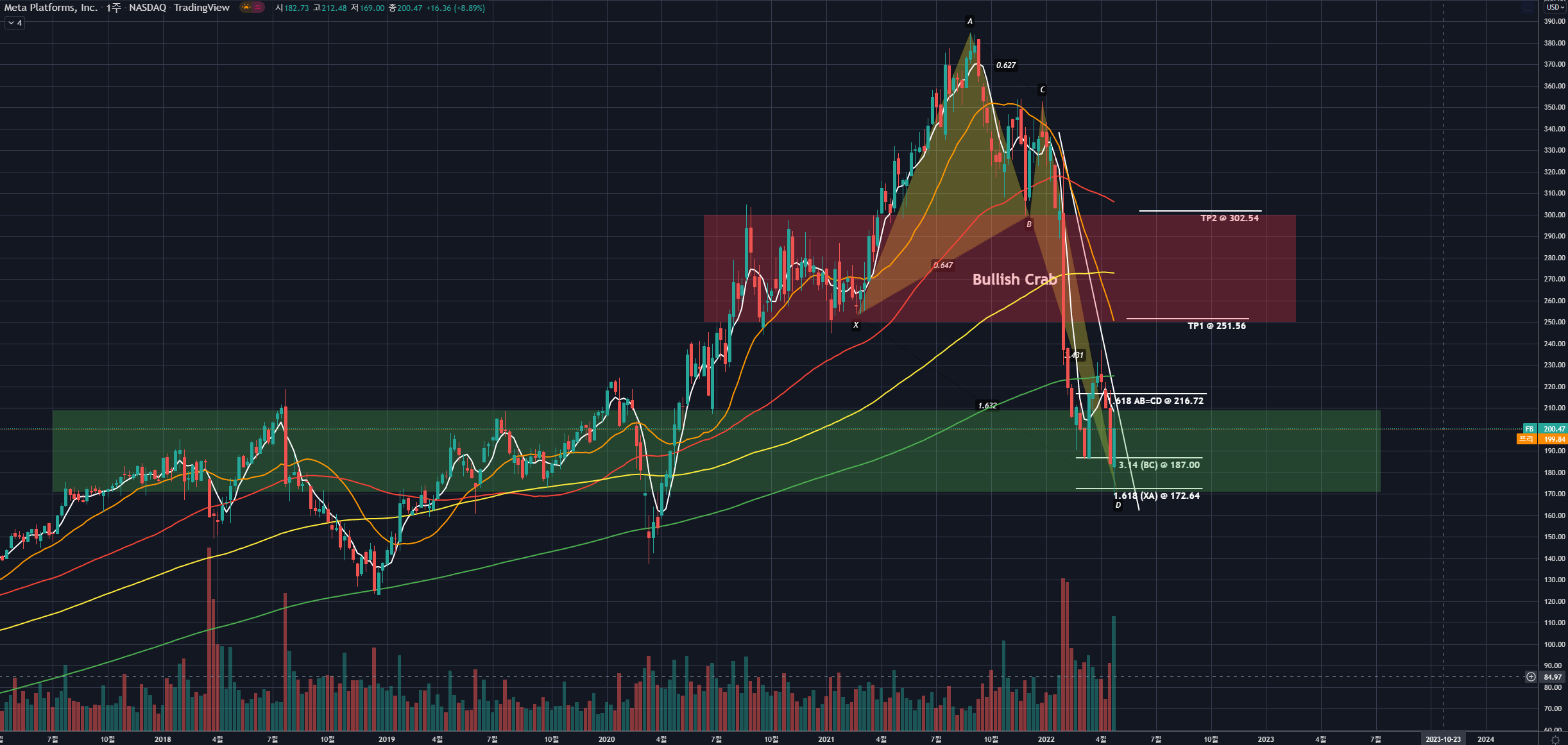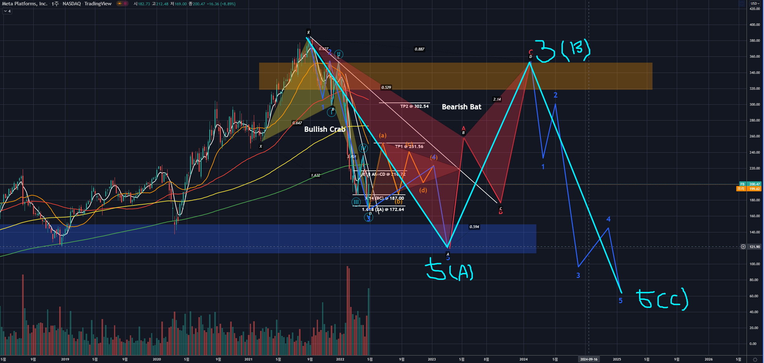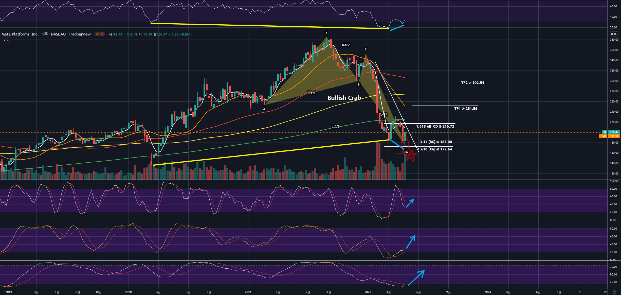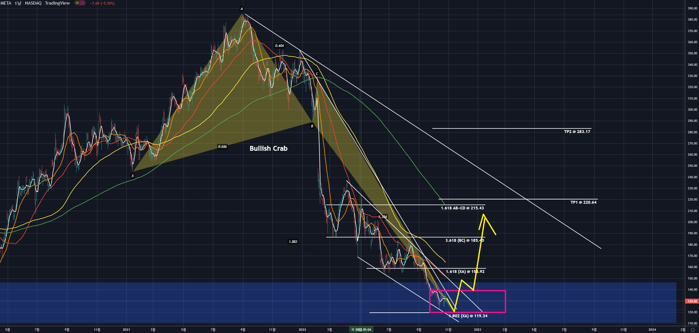 현재 메타플랫폼 어닝발표가 안 좋게 나왔습니다. 그렇지만 차트는 폴링웻지와 하락추세선 상향돌파 임박, 그리고 Bullish Crab PRZ에 머물러 있습니다. 또한 나스닥의 11월 상승장 임박 등으로 볼 때 추세선을 상향돌파할 때 매수해볼만한 것 같습니다.