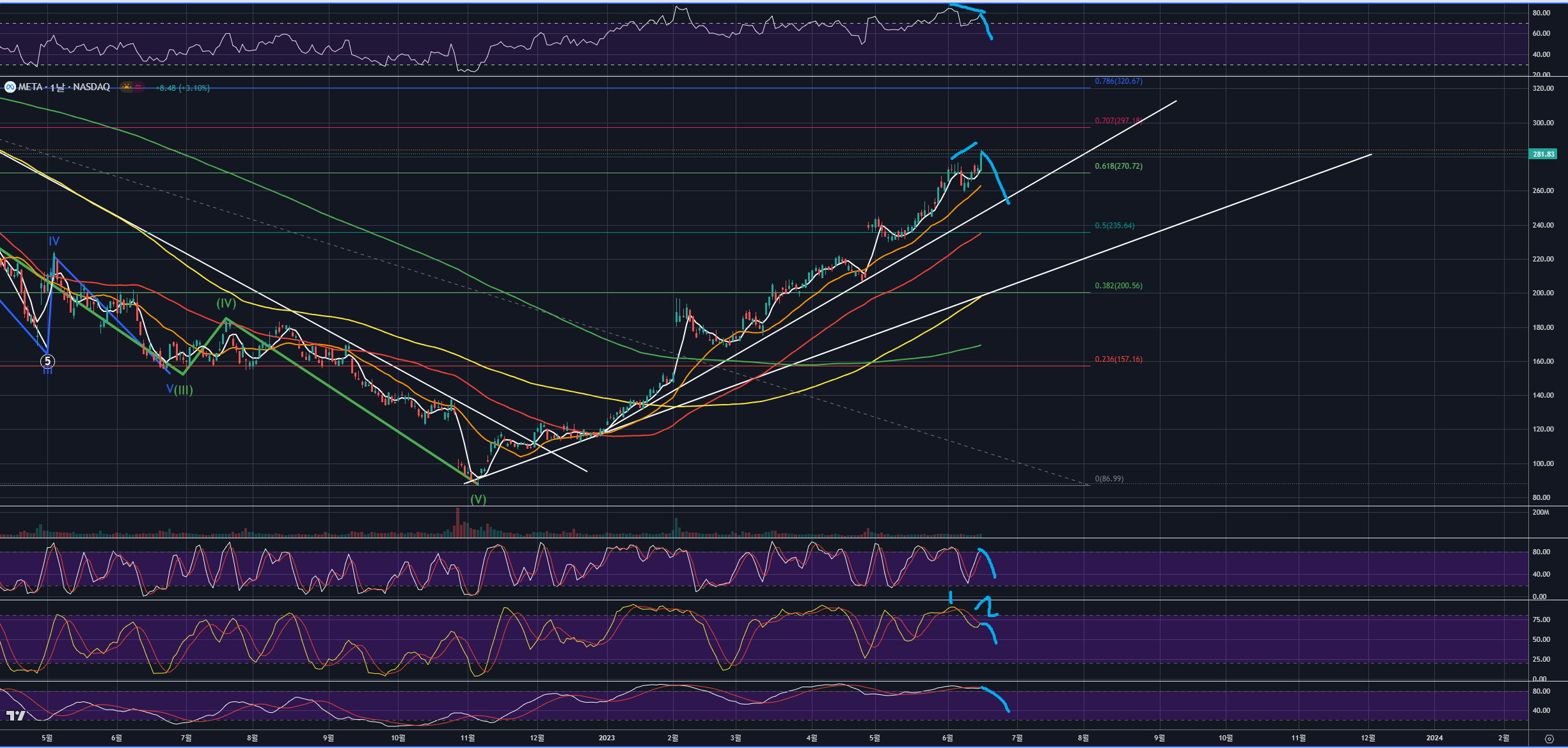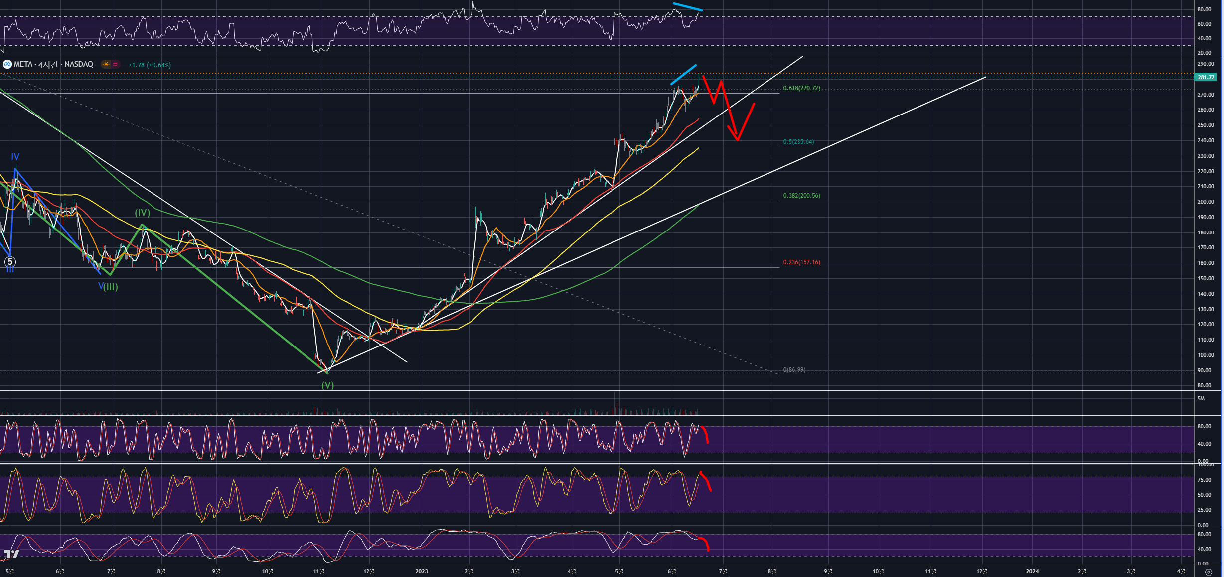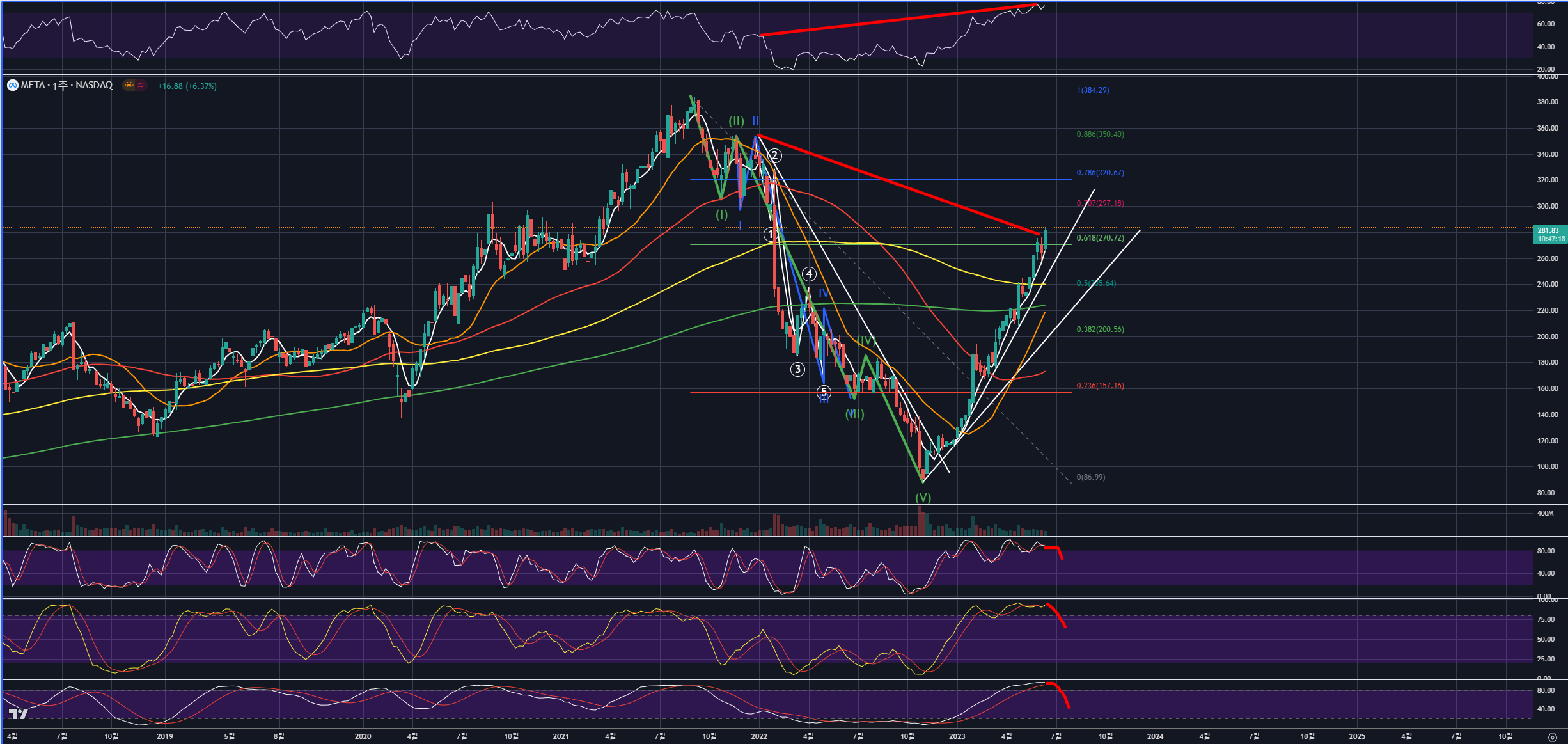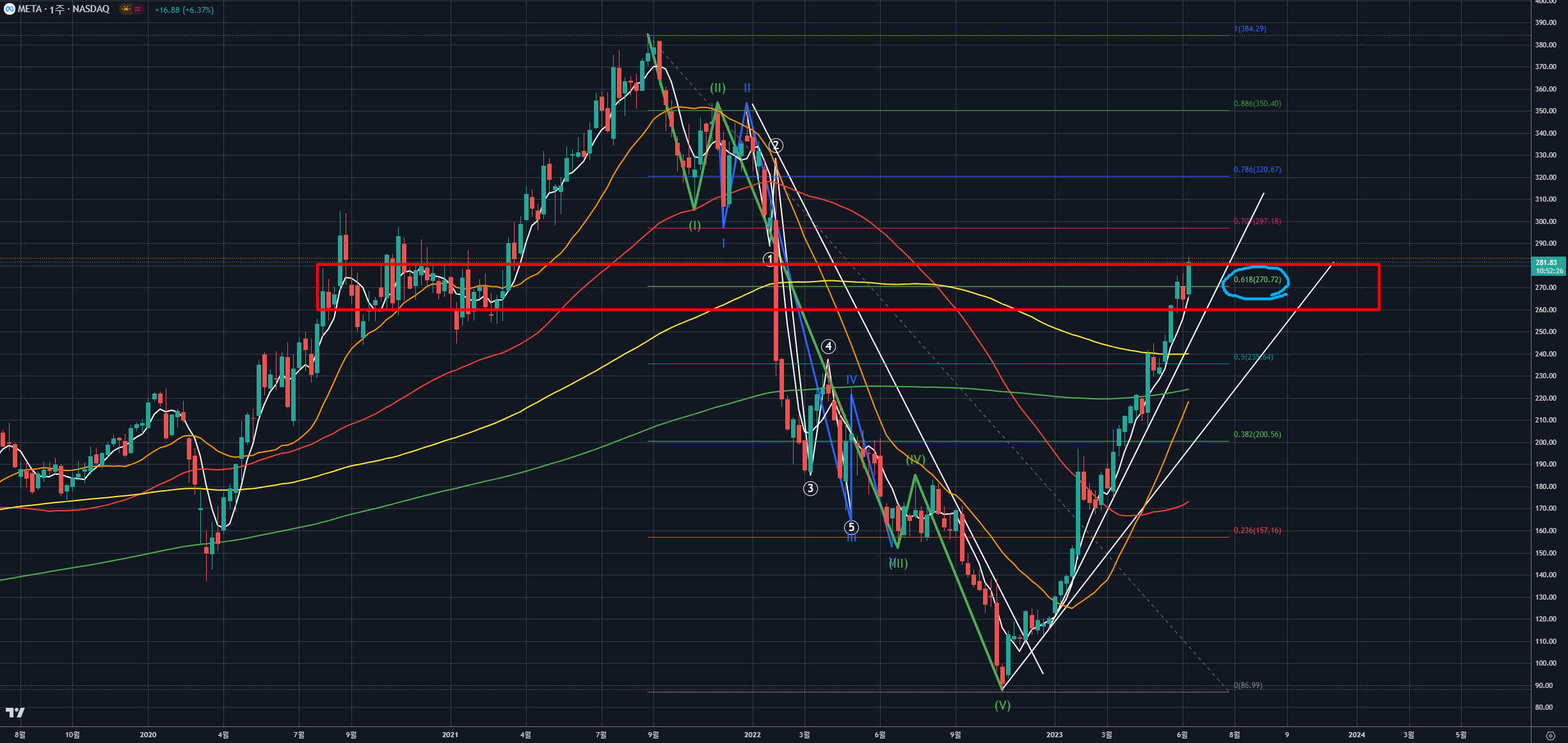 위 차트는 메타 주봉 차트로, 피보나치 0.618 되돌림까지 상승하였습니다. 이 구간은 빨간색으로 표시한 수평매물대 구간이고, 상승이 가파라서 큰 조정이 나올 수 있는 구간입니다.