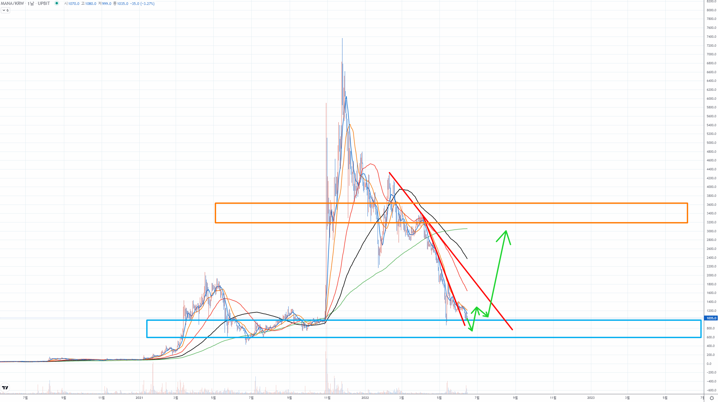 위의 MANA 코인 일봉 차트의 매물대를 보면, 현재 파란색의 수평매물대에서 지지를 받고 있는 것도 확인됩니다. 이 파란색의 수평매물대는 강하게 하향돌파되지 않을 것으로 보이고, 강한 지지로 작용할 것으로 보입니다. 개인적으로 현재 하락피로도가 매우 심하다고 생각됩니다.