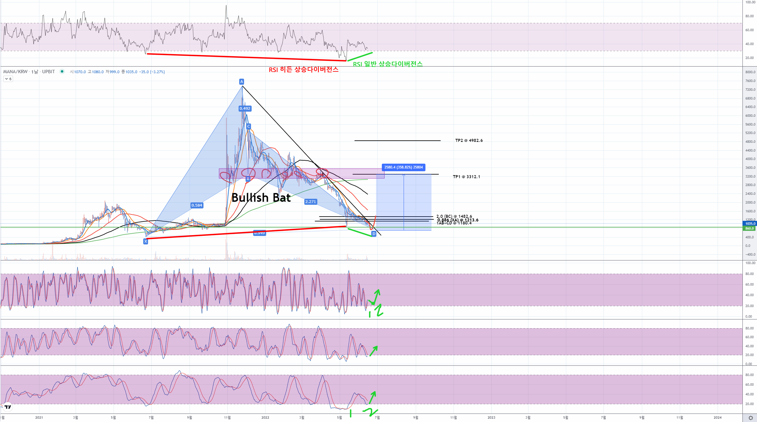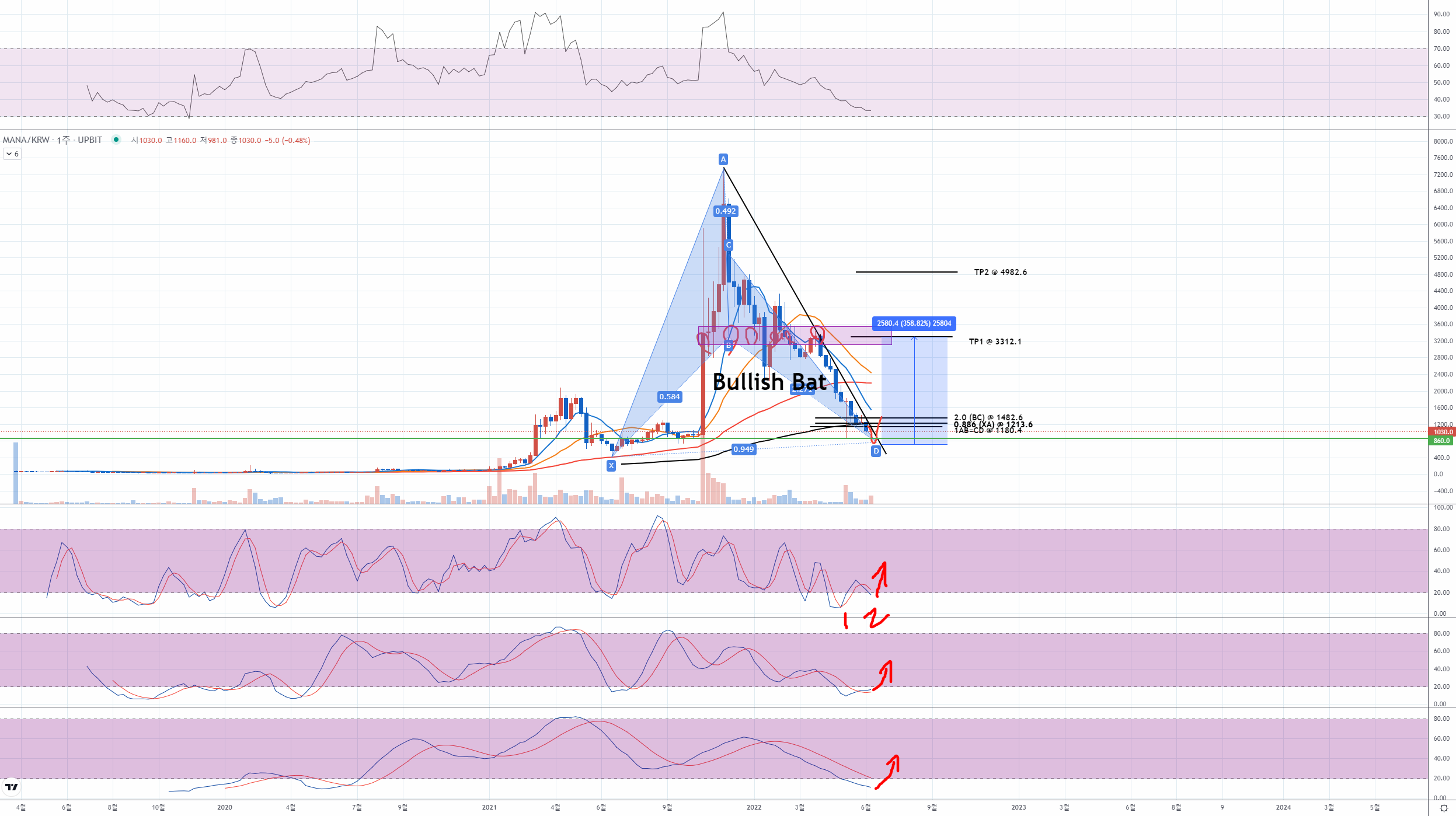 이 가격대에서 상승반전한다면 하모닉 패턴의 TP1 자리에서 강한 저항이 예상됩니다. 이 부근은 21년 10월부터 매물대를 많이 만들어온 구간으로, 강하게 돌파하기보다 한 번의 큰 저항을 받을 것 같네요. 그래서 해당 반전후에는 욕심을 부리지 말고 Bullish Bat의 TP1인 3300원 인근에서 최소 50%의 물량을 정리하는 것이 좋아보입니다.