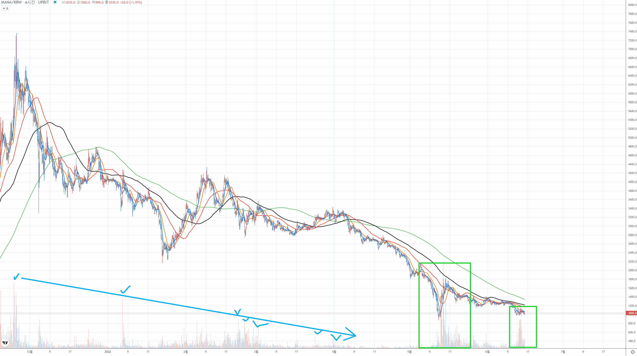 4시간 봉 차트를 보더라도, 21년 11월 최고점 이후 파란색 화살표대로 거래량이 꾸준히 감소하였으며, 최근 22년 5월 거래량이 초록색 좌측 박스와 같이 폭증한 것을 알 수 있습니다. 또한 최근 하락에서 초록색 우측 박스와 같이 다시 거래량이 증가하고 있죠.